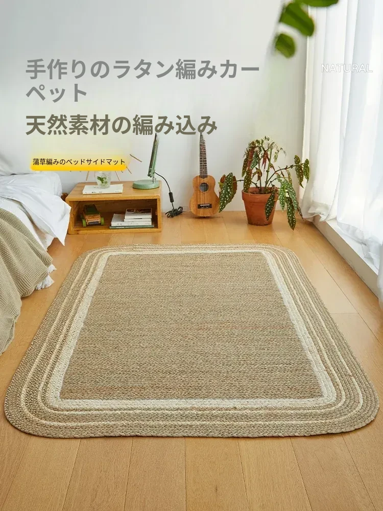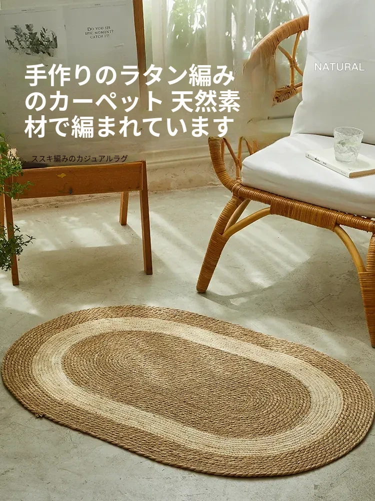 手作の草編みラグマット - 厚手デザインで客間やソファにぴったり!高級感あふれる民宿スタイルのベッドサイドマット。リラックス空間を演出するおしゃれアイテム!