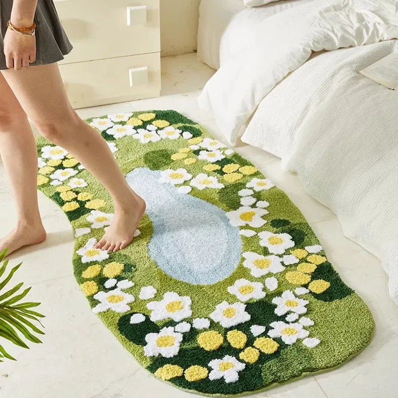 高級感溢れるグリーンモスベッドサイドラグ|ユニークな形状のフロアマットで、寝室に心地よい癒し空間を演出します。柔らかな植毛素材で足元を優しく包み込み、リラックスしたひとときを提供します。