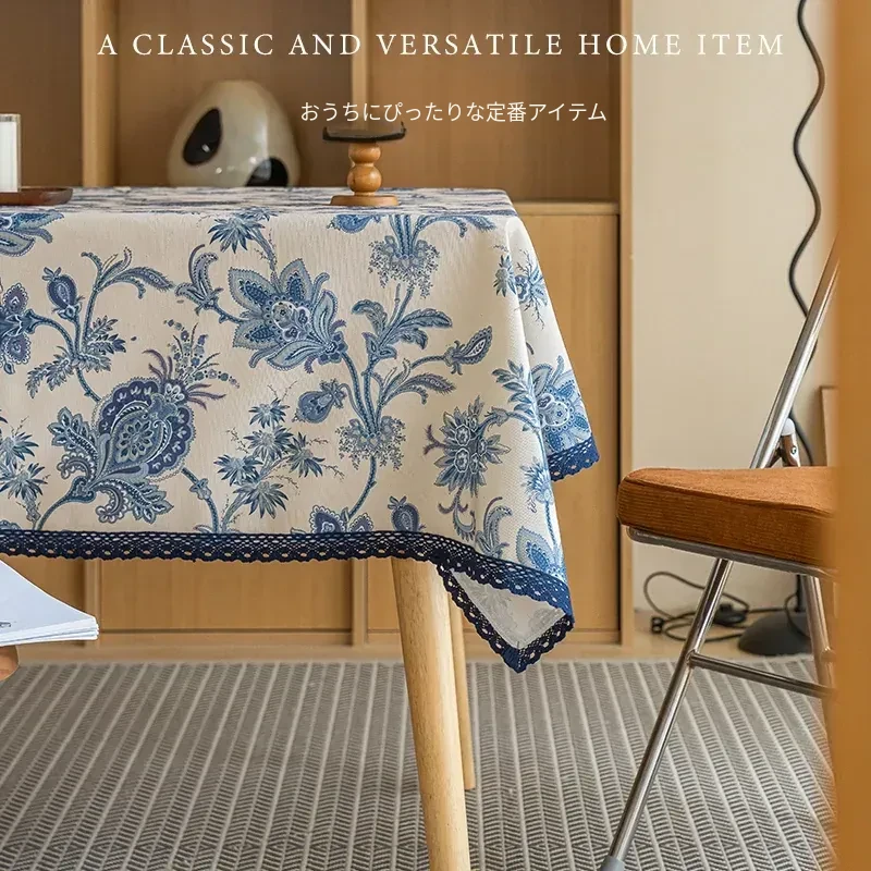 フランス風レトロ麻感テーブルクロス - 青花瓷デザインで高級感溢れる、ピクニックやキャンプに最適な家用テーブル布!おしゃれなティーテーブルにぴったり!