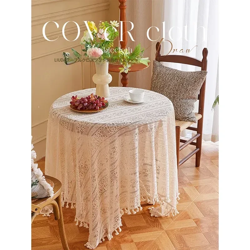 フランス風ヴィンテージレーステーブルクロス - シンプルで高級感漂う円形デザイン!お洒落なリビングやカフェにぴったりな田園スタイル。サイドテーブルやティーテーブルを飾る完璧なアイテムです。