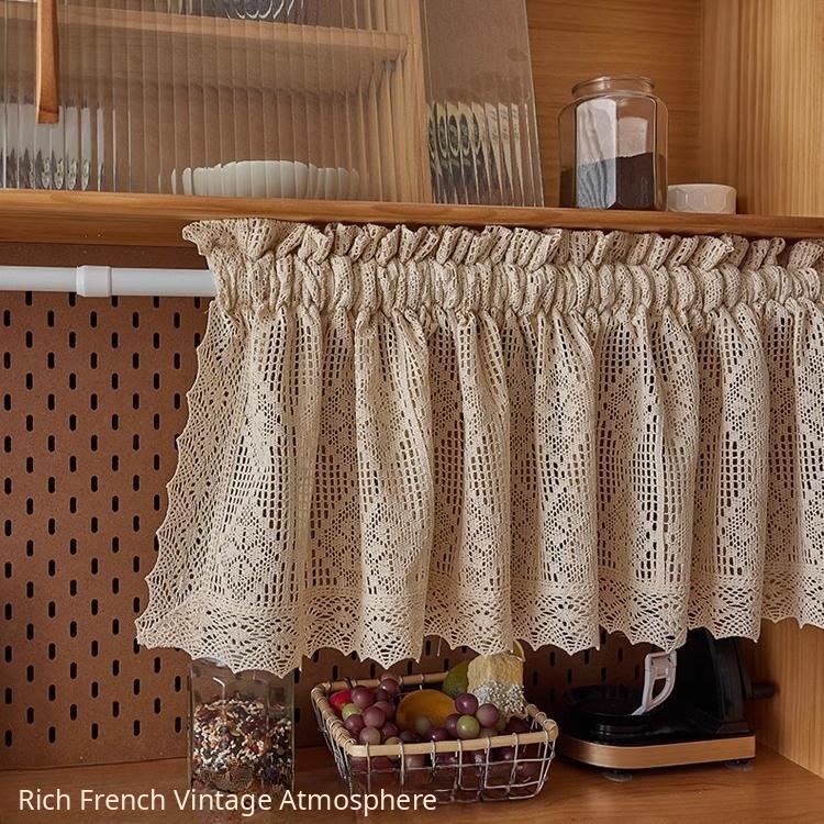French Vintage Cotton Crochet Kitchen Cabinet Curtain - No Drill, Doorless Design for Stylish Storage Solutions and Clutter Concealment