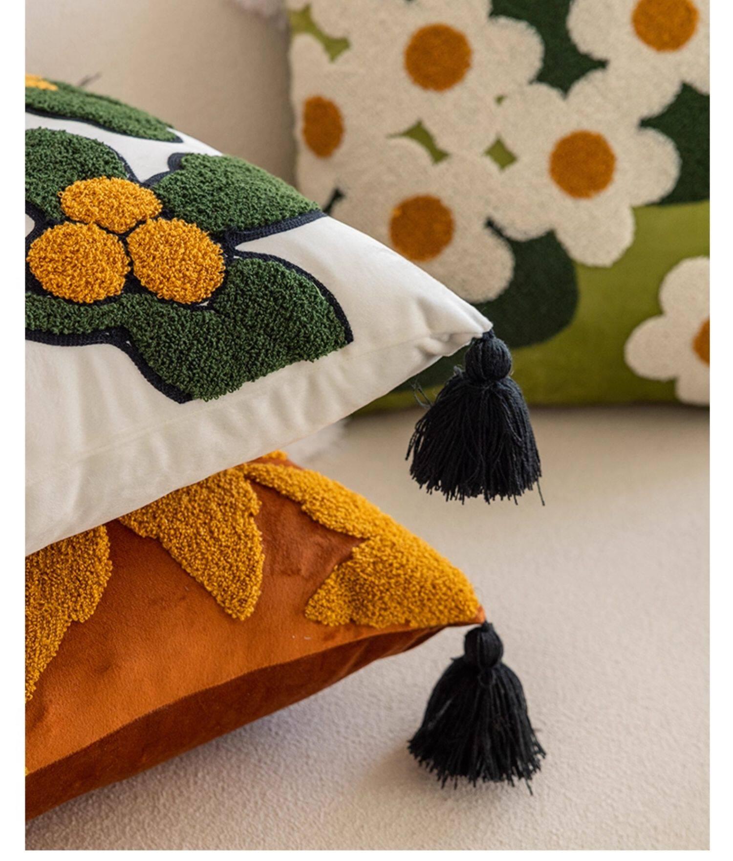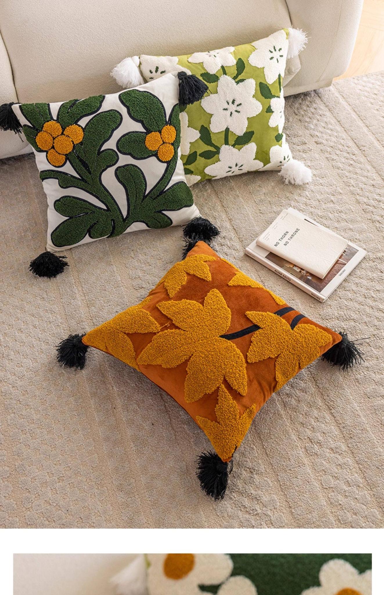 Bright Autumn Cherry Blossom Embroidered Throw Pillow