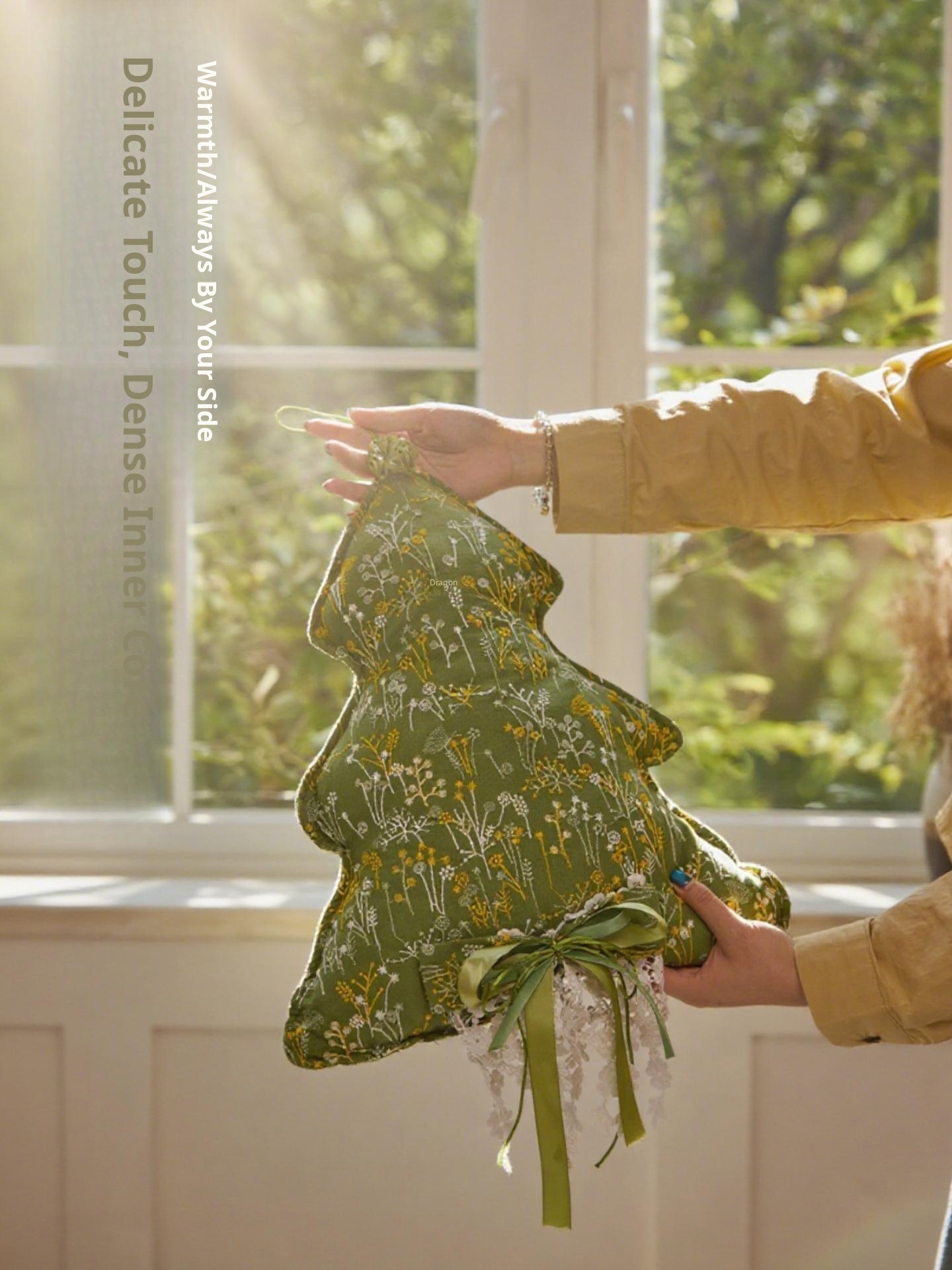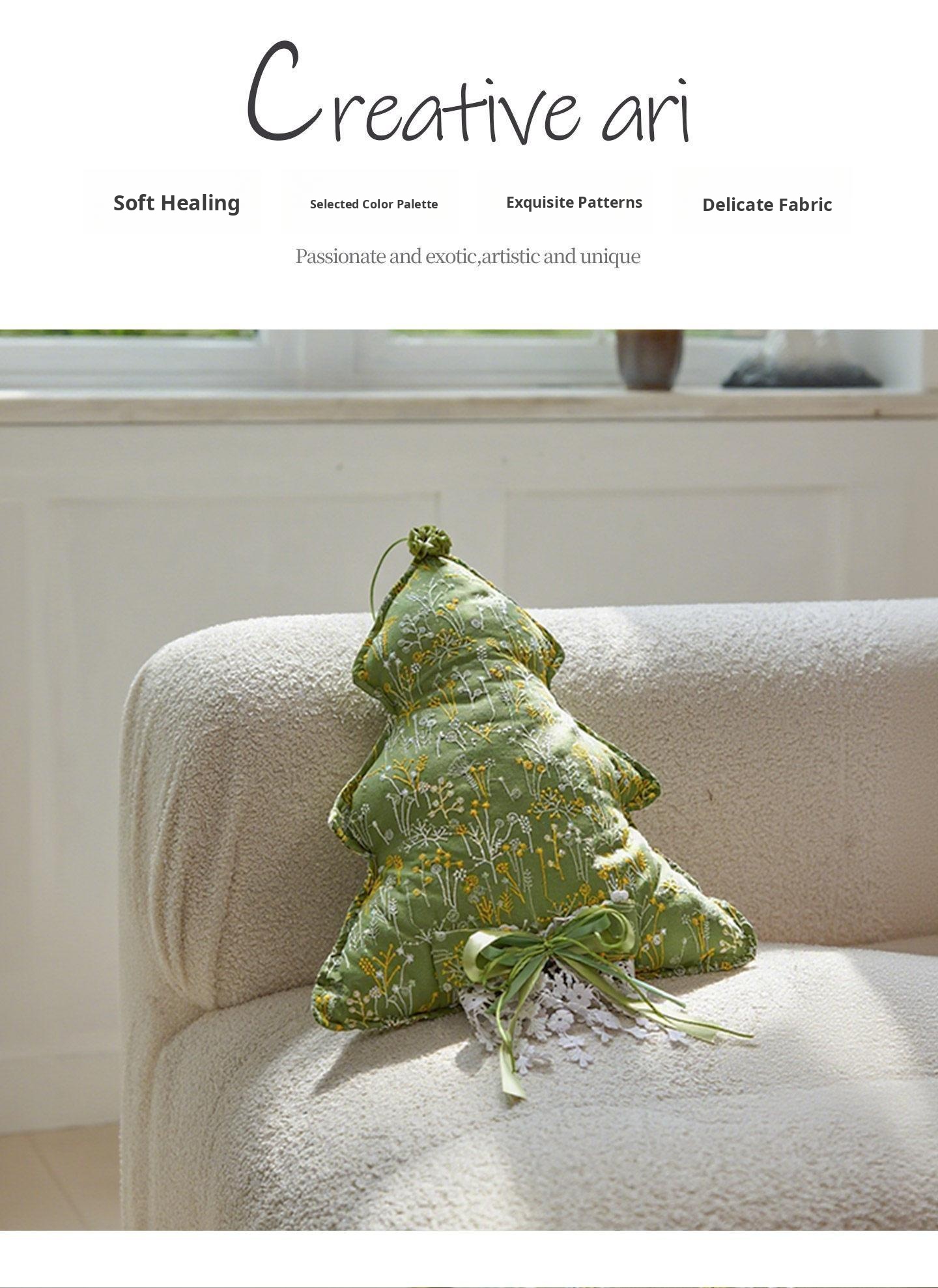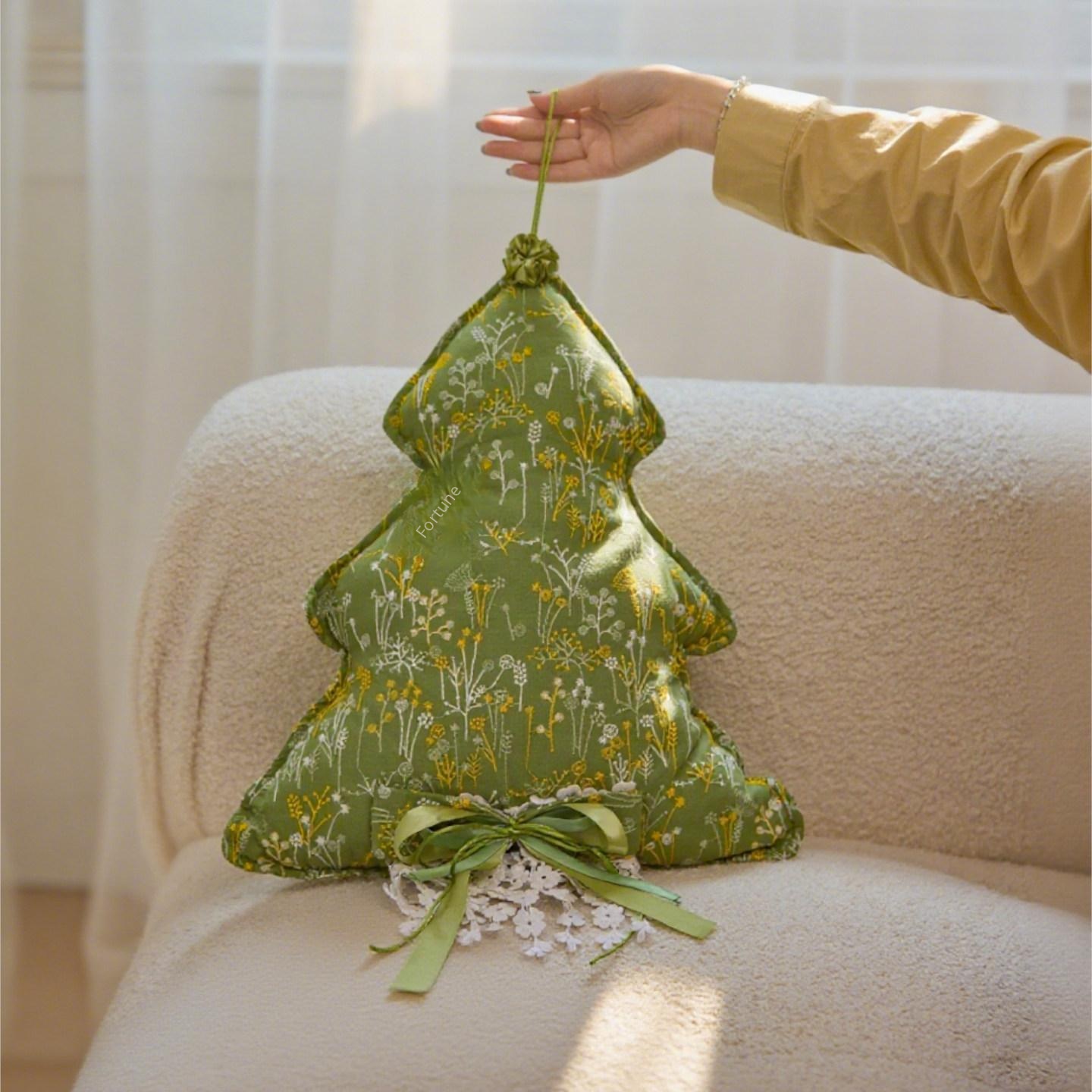 Forest Green Embroidered Christmas Tree Throw Pillow - Unique Shaped Cushion for Living Room, Sofa, Bedroom, and Bay Window - Decorative Fabric Waist Pillow Cover for Cozy Home Decor