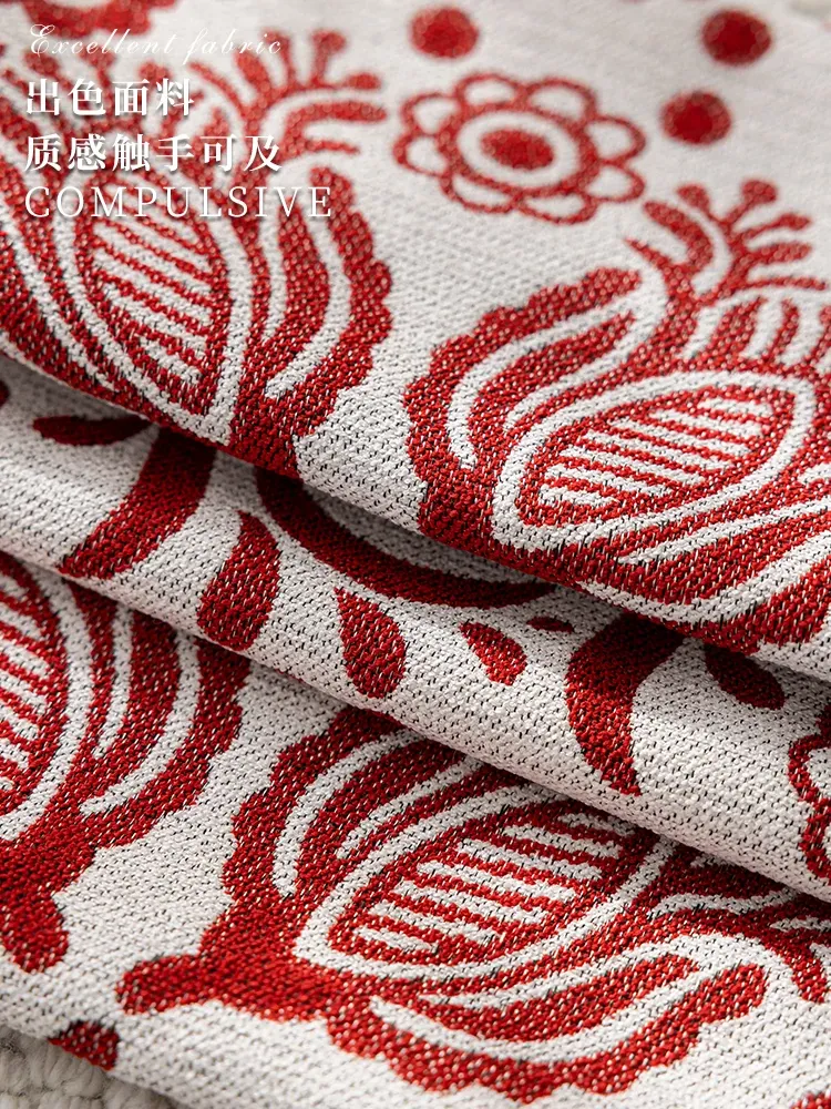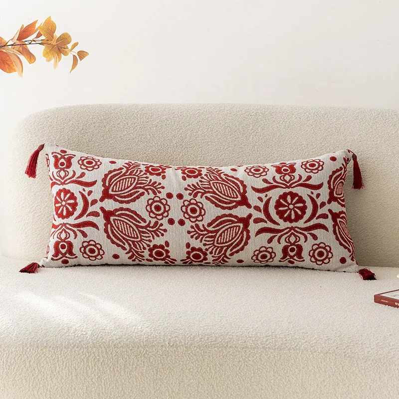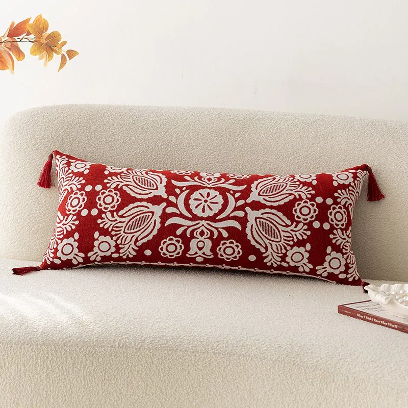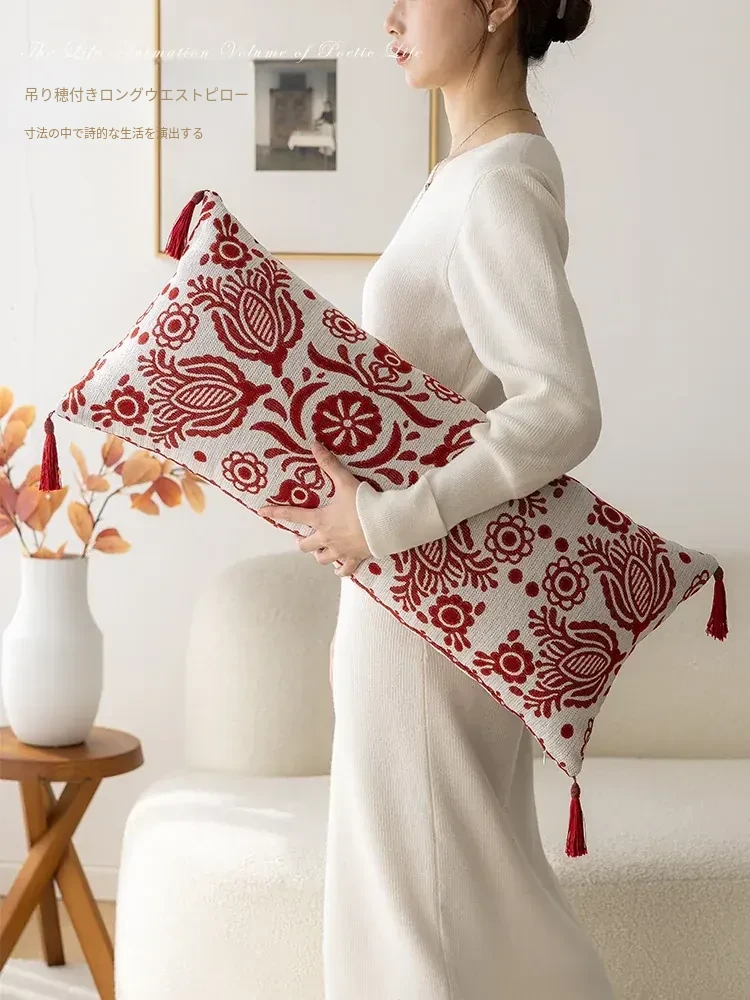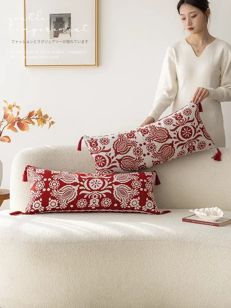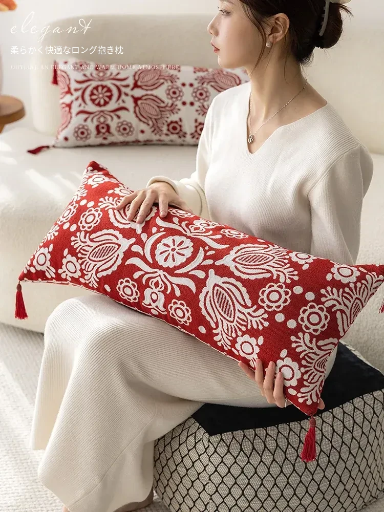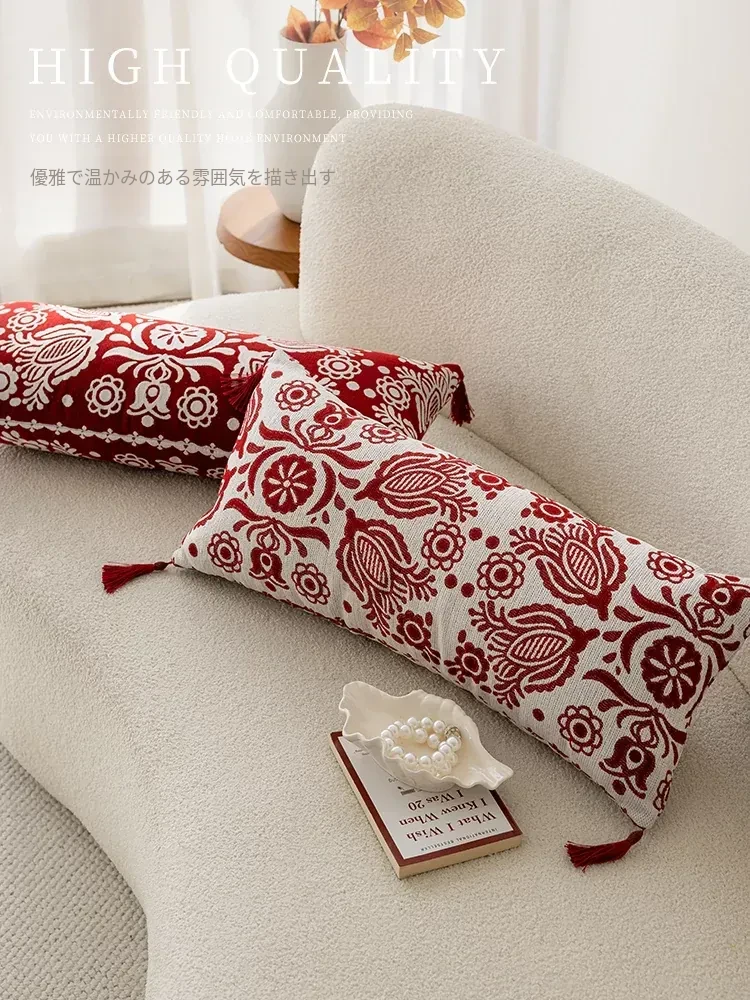アメリカンハイエンドスタイルの長方形ウエストクッション|美しいデザインの中古抱き枕|リビングやソファに最適な赤いロングクッションで、インテリアを華やかに演出!
