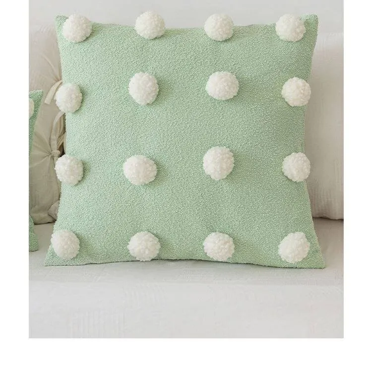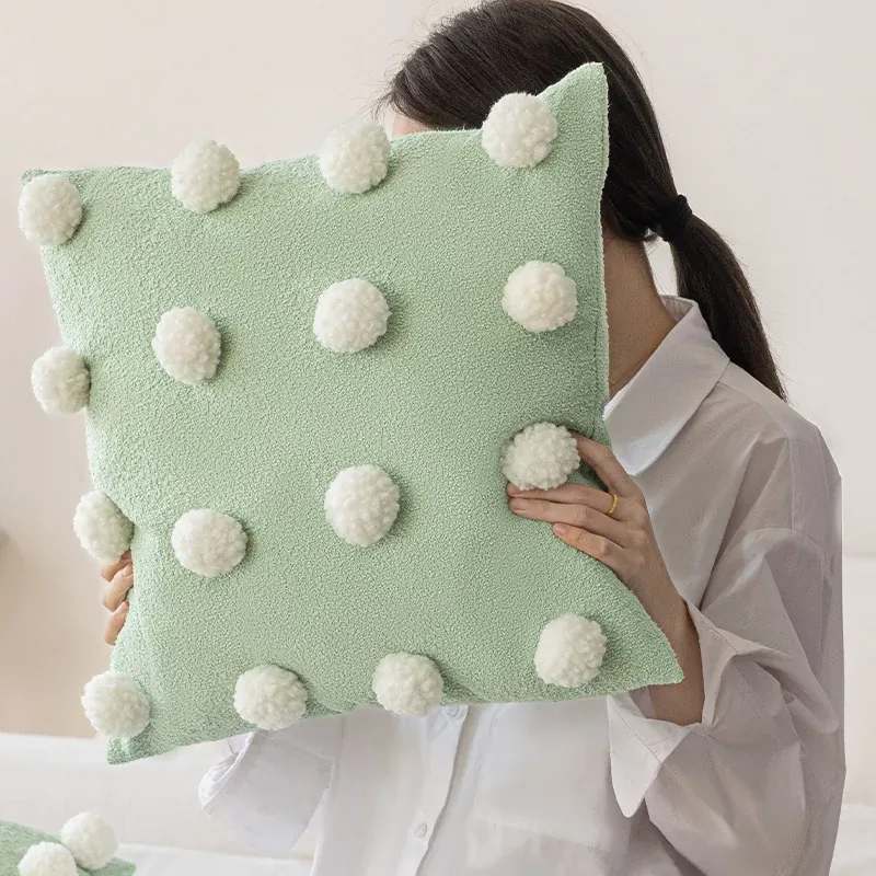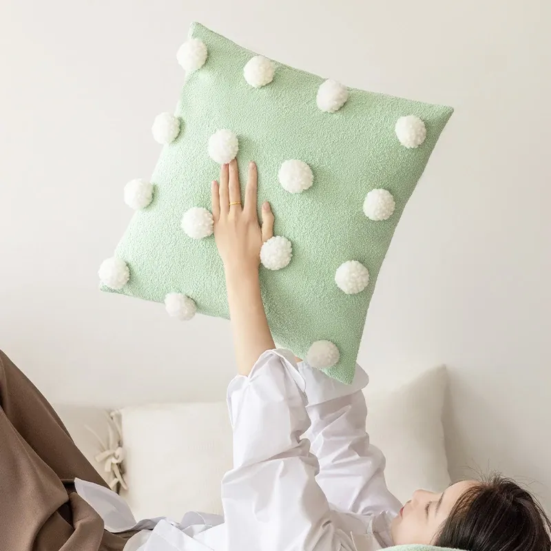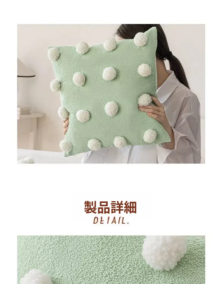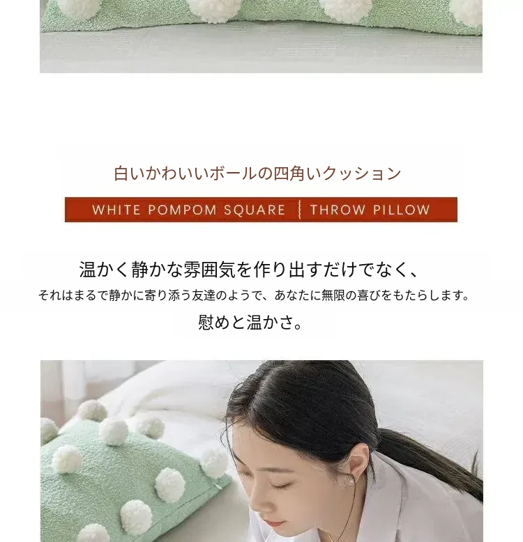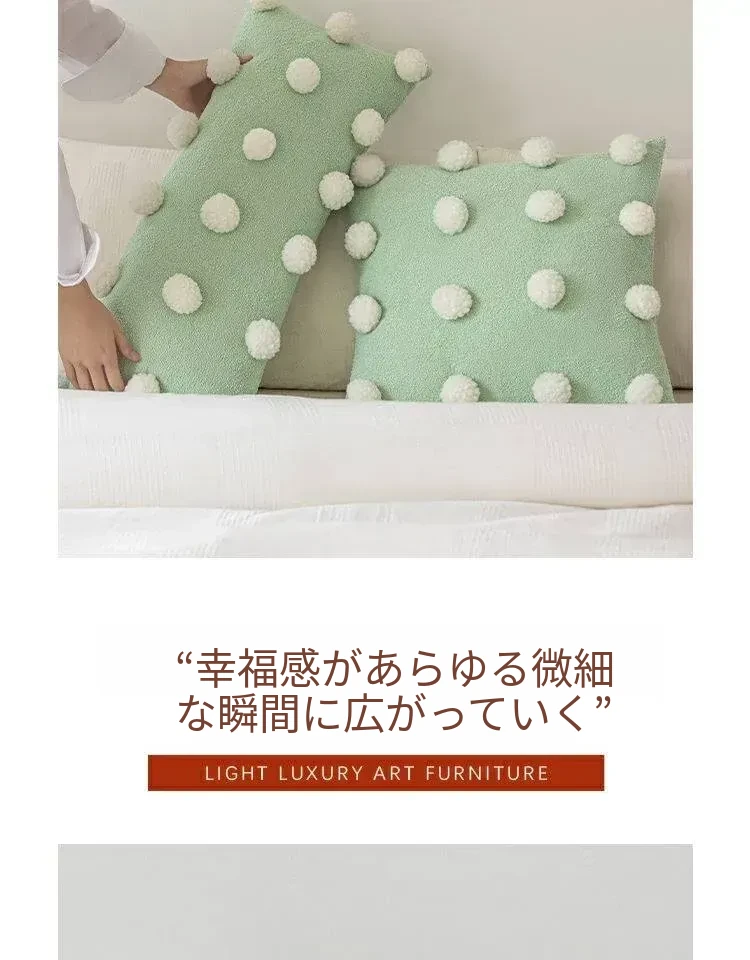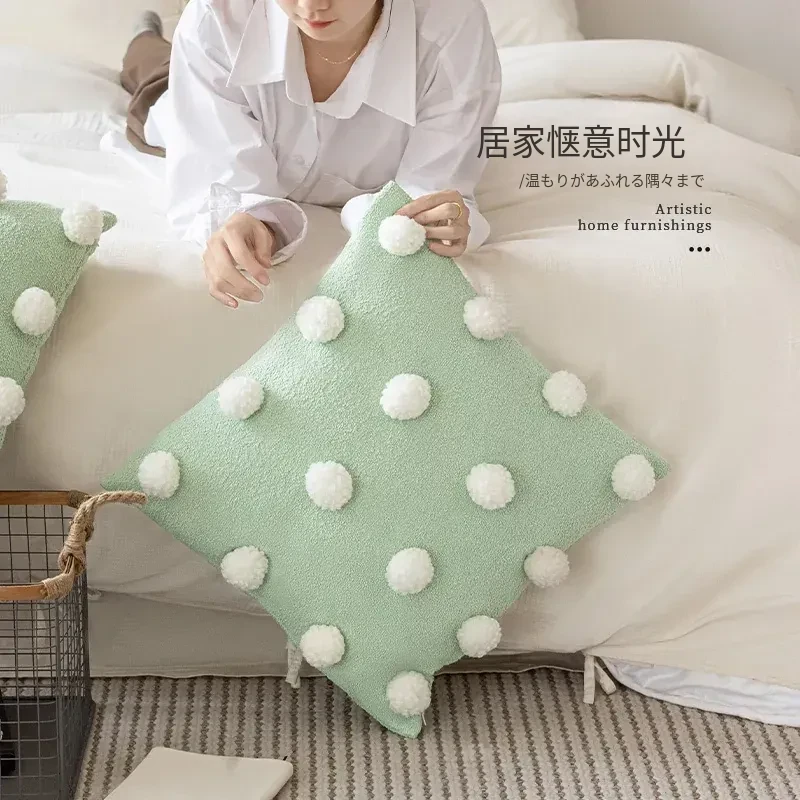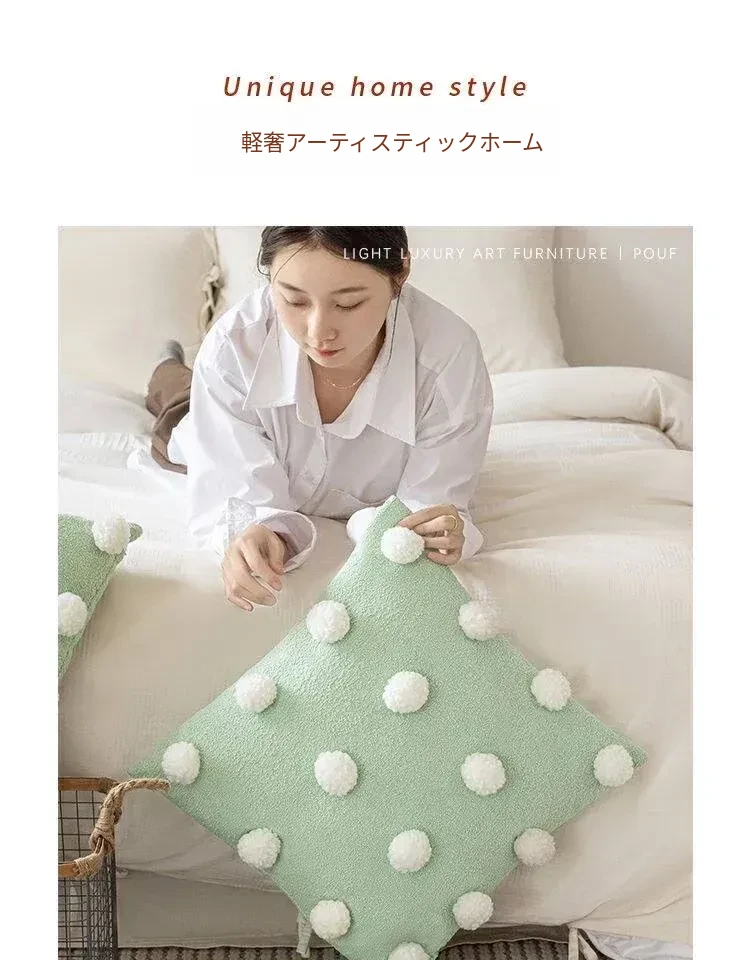 クリーム色の高級ライトラグジュアリー風クッションカバー、かわいいファー玉付き、ソファやベッドにぴったりの腰当てクッション、芯入りで窓辺にも最適!