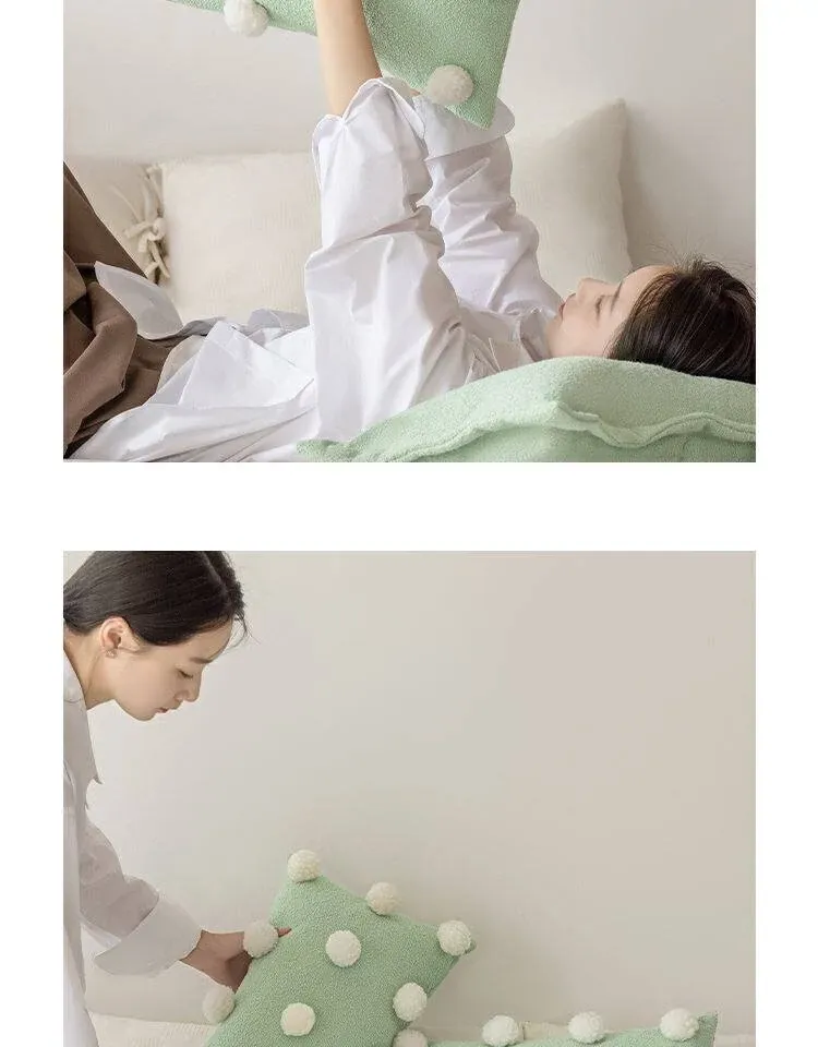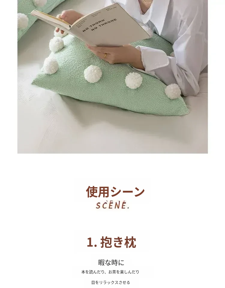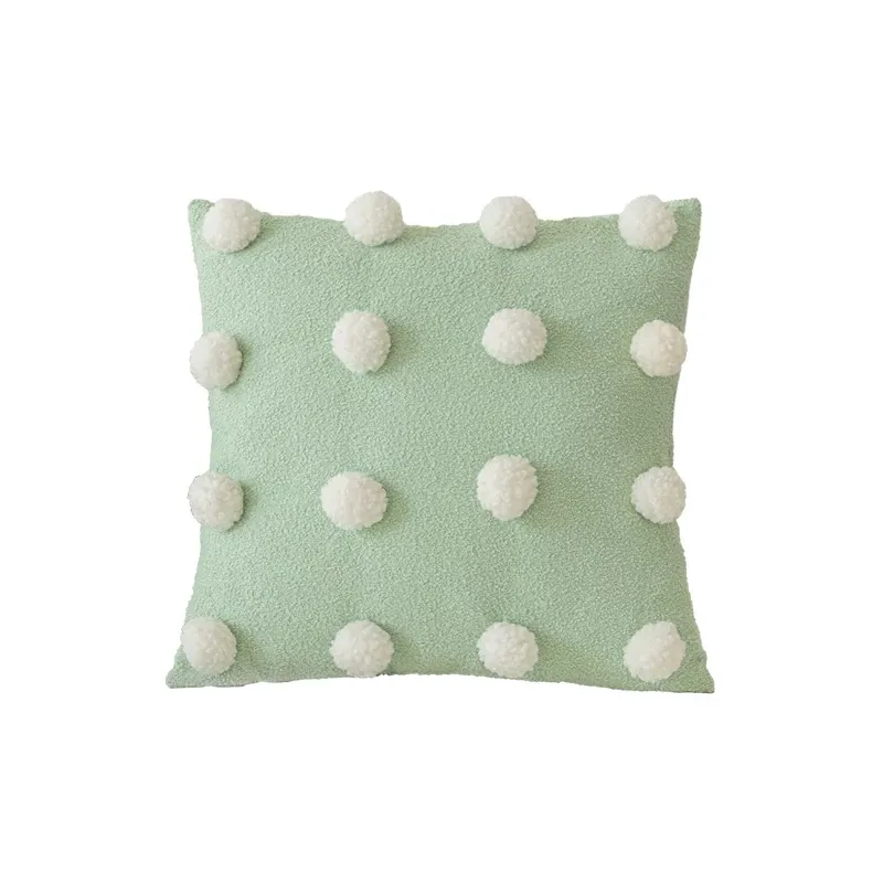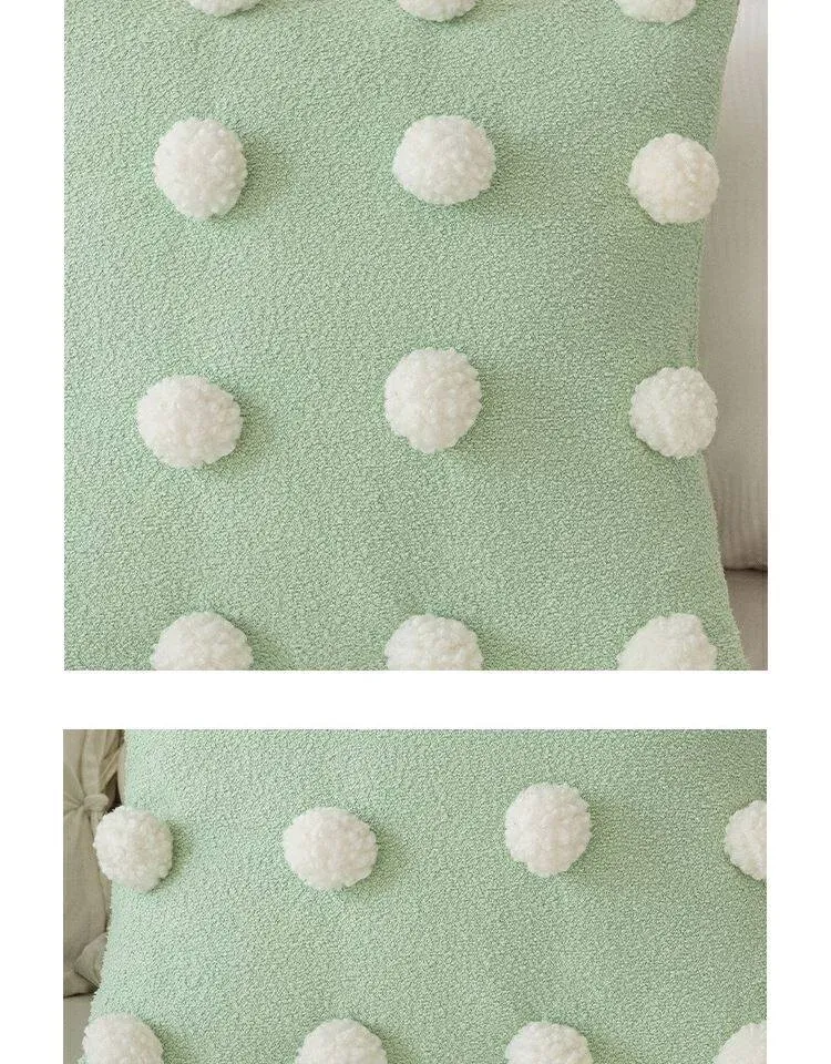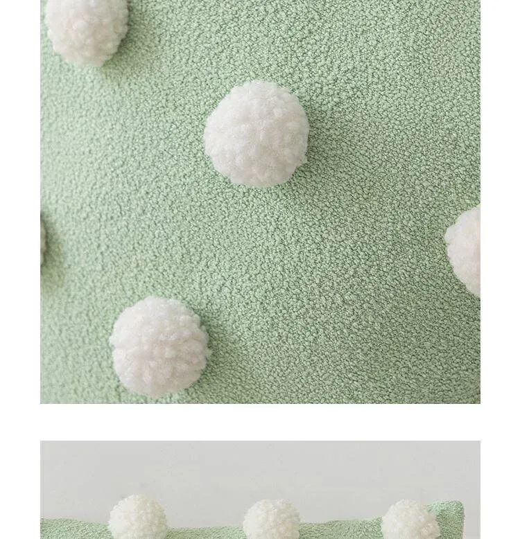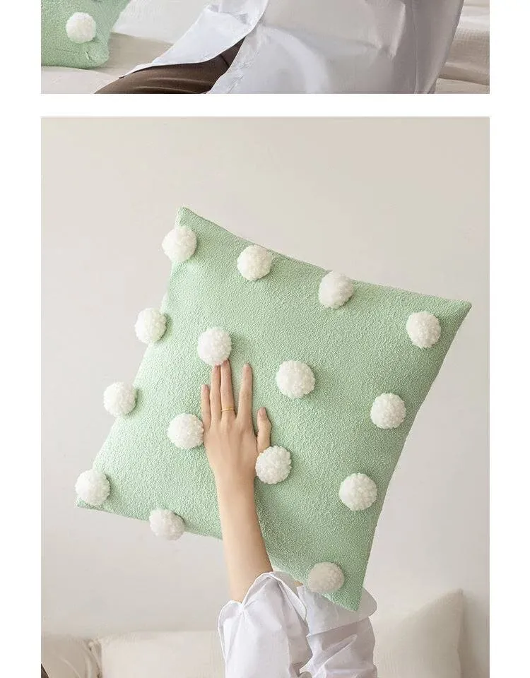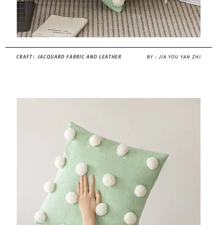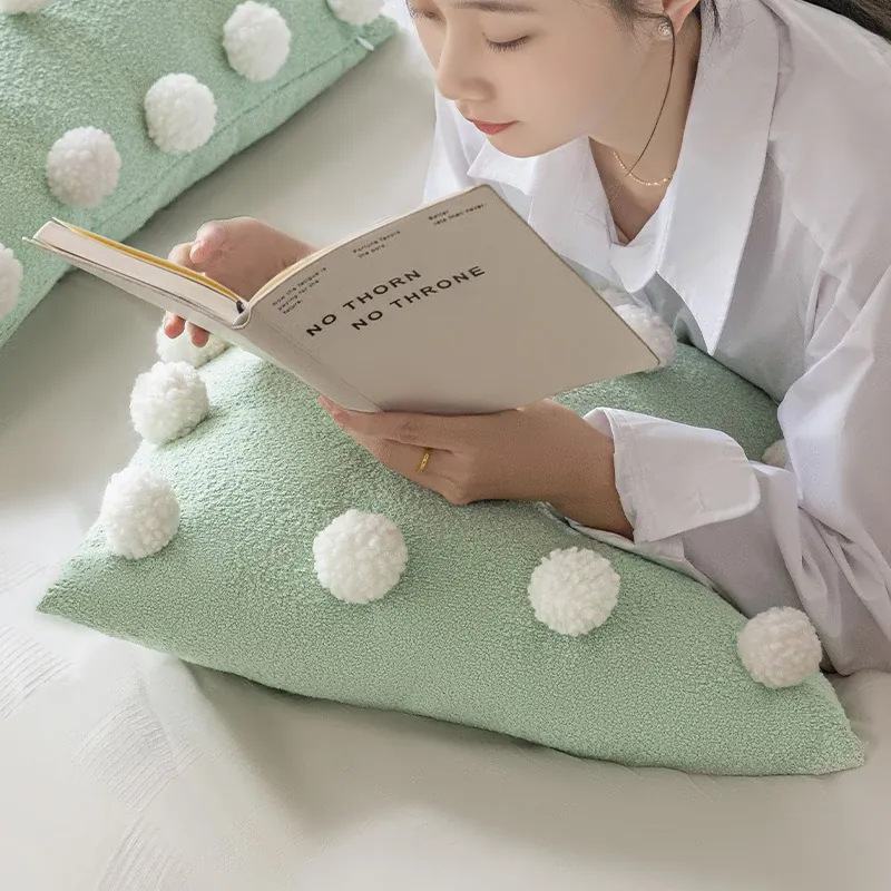 クリーム色の高級ライトラグジュアリー風クッションカバー、かわいいファー玉付き、ソファやベッドにぴったりの腰当てクッション、芯入りで窓辺にも最適!