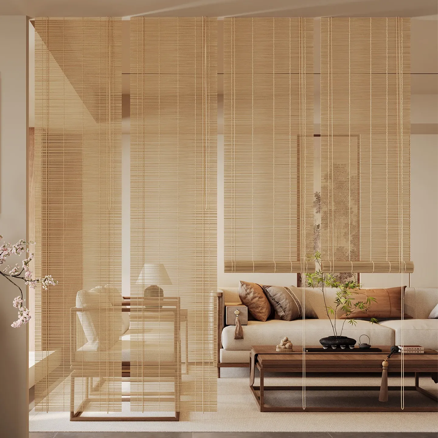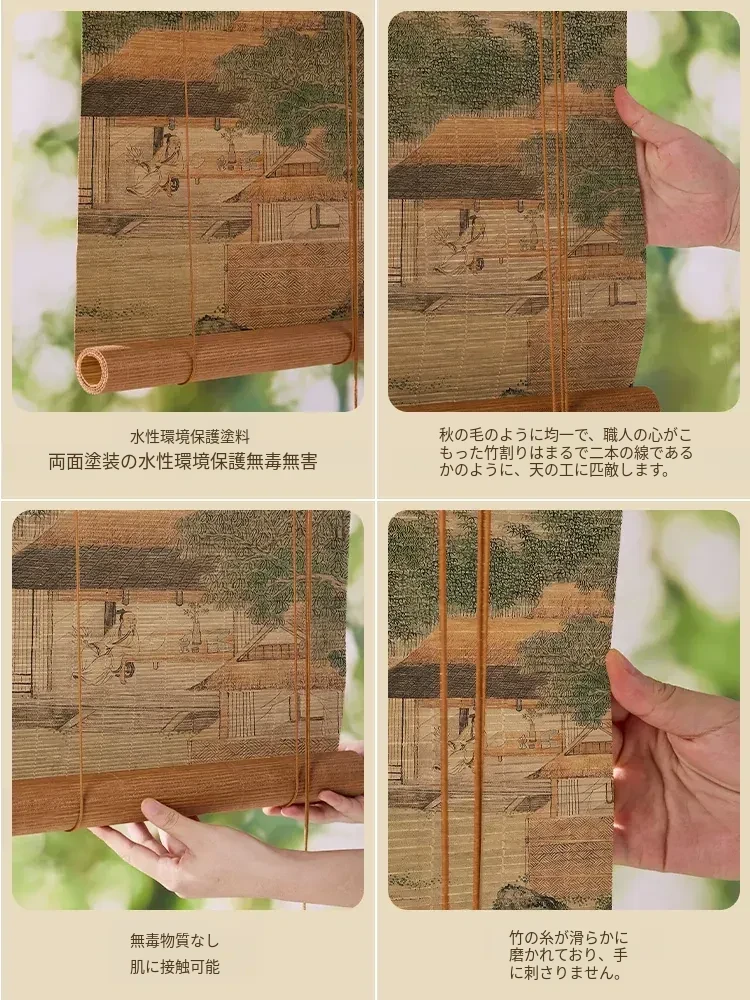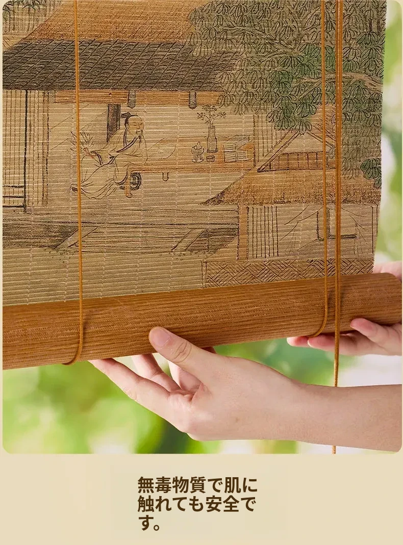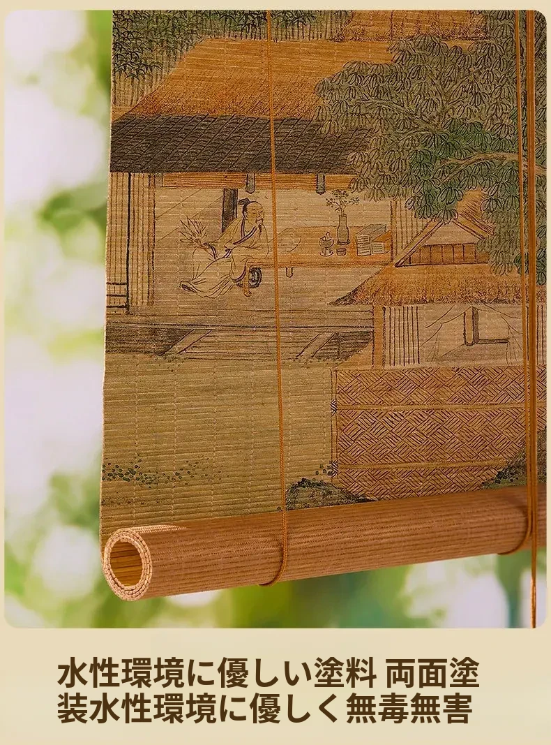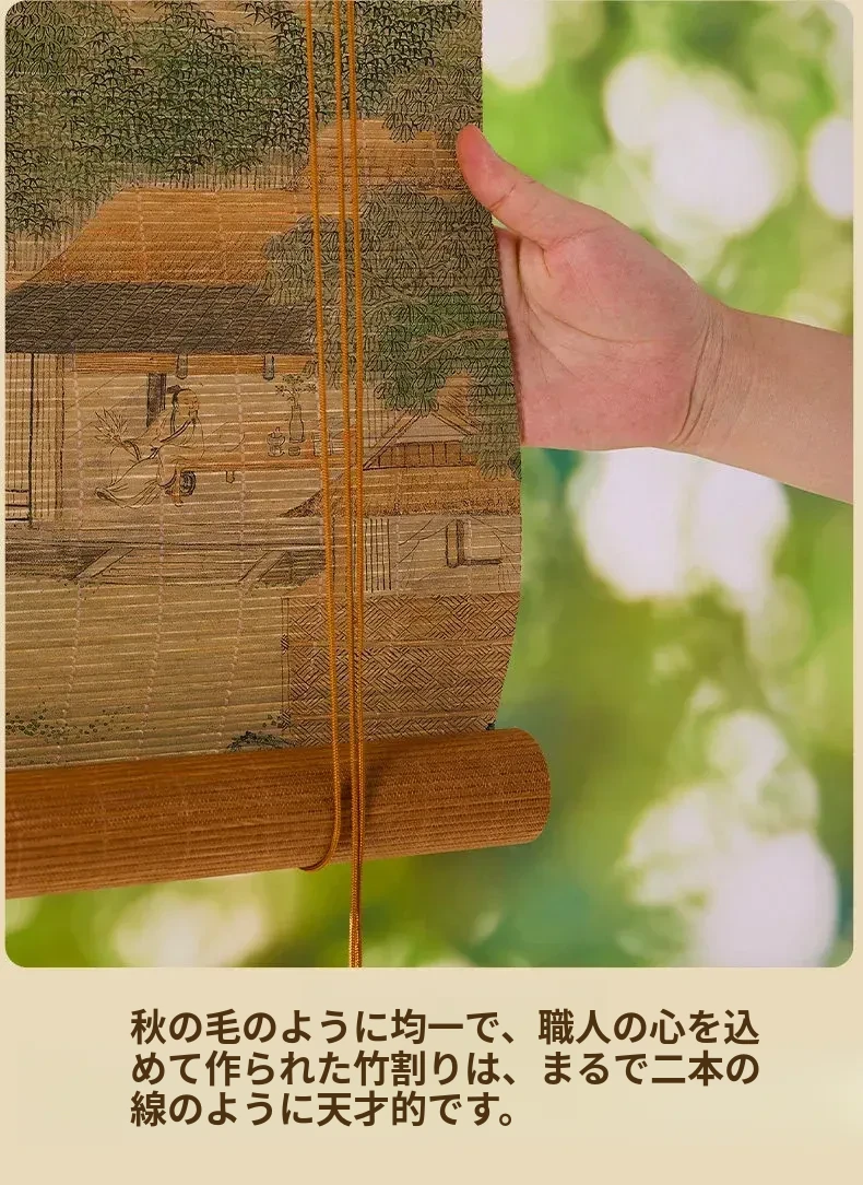 新中式デザインの穴無し竹製ロールカーテン - 宋の美学を感じる竹編みの掛けカーテン。禅の雰囲気で茶室を演出し、日差しを遮りつつプライバシーを守ります。