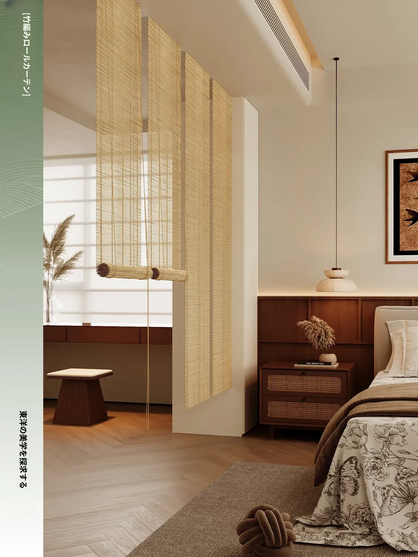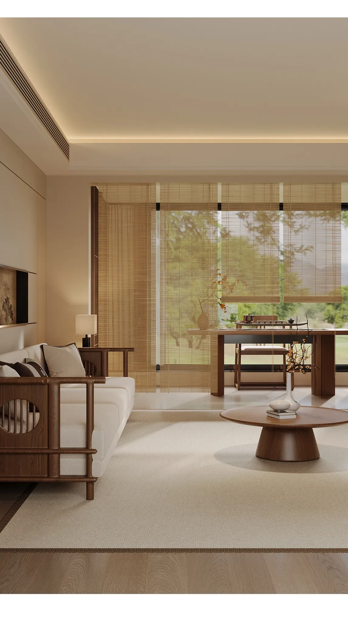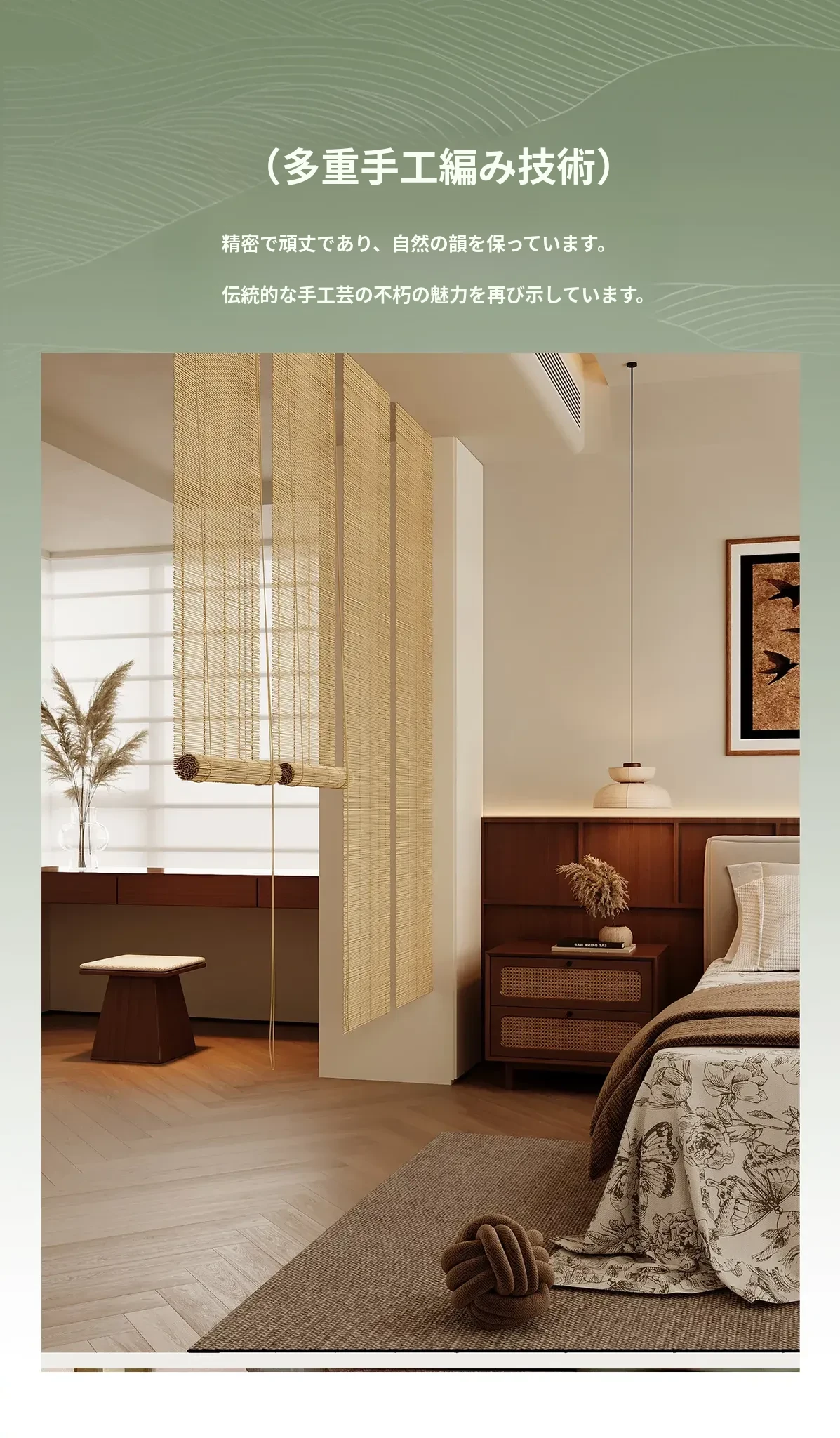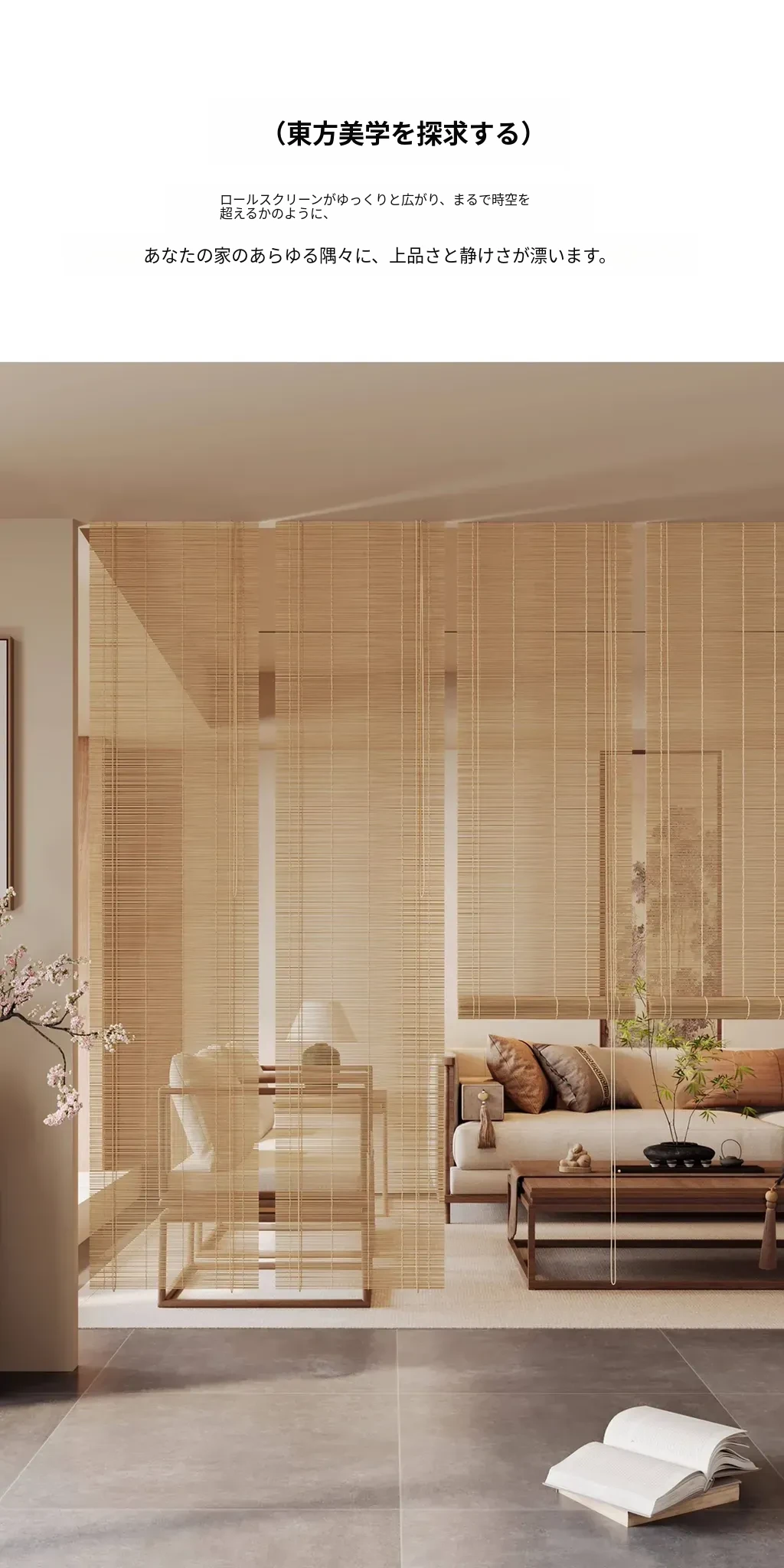 新中式デザインの穴無し竹製ロールカーテン - 宋の美学を感じる竹編みの掛けカーテン。禅の雰囲気で茶室を演出し、日差しを遮りつつプライバシーを守ります。