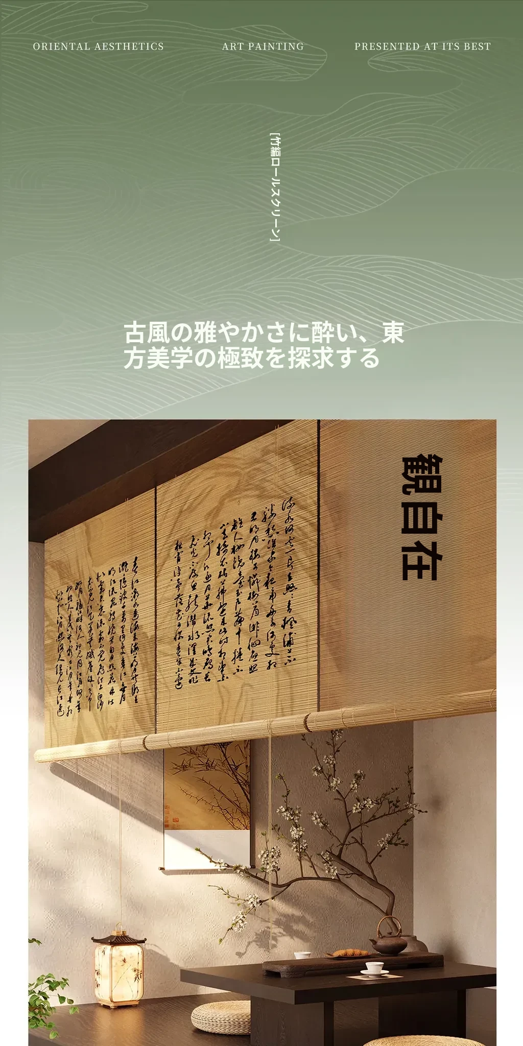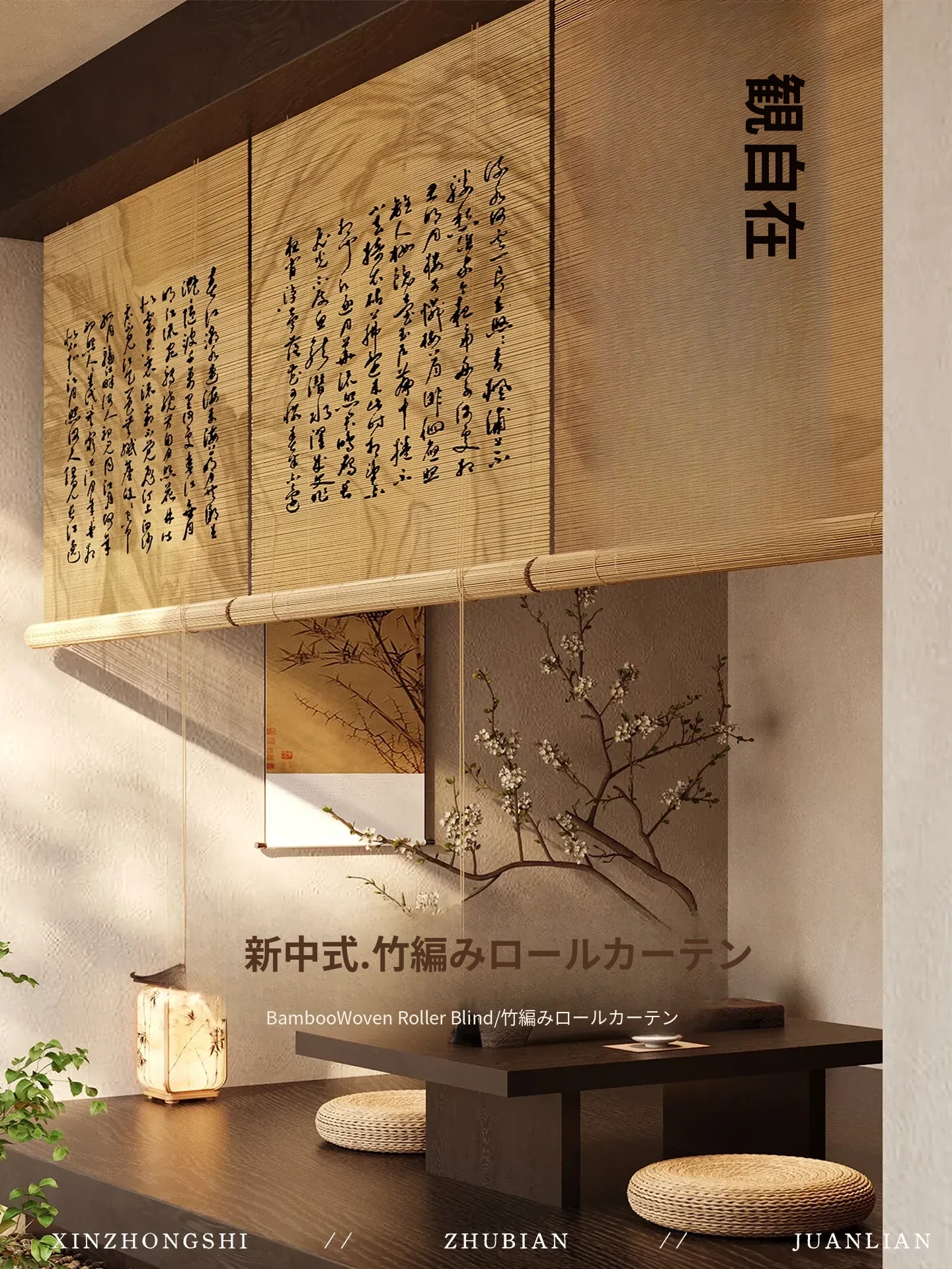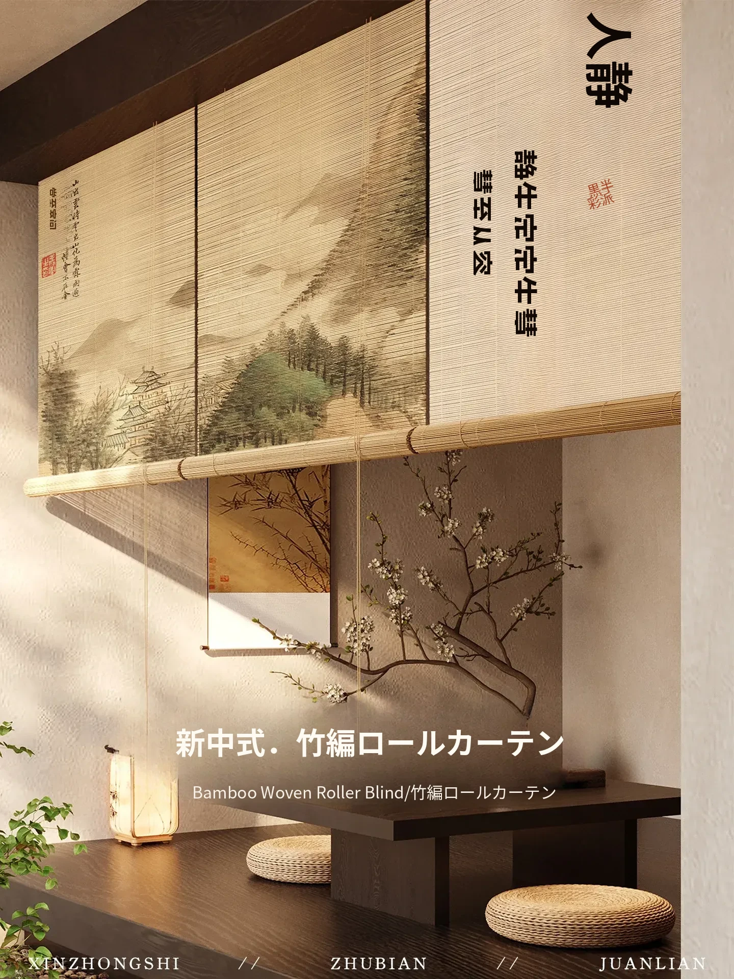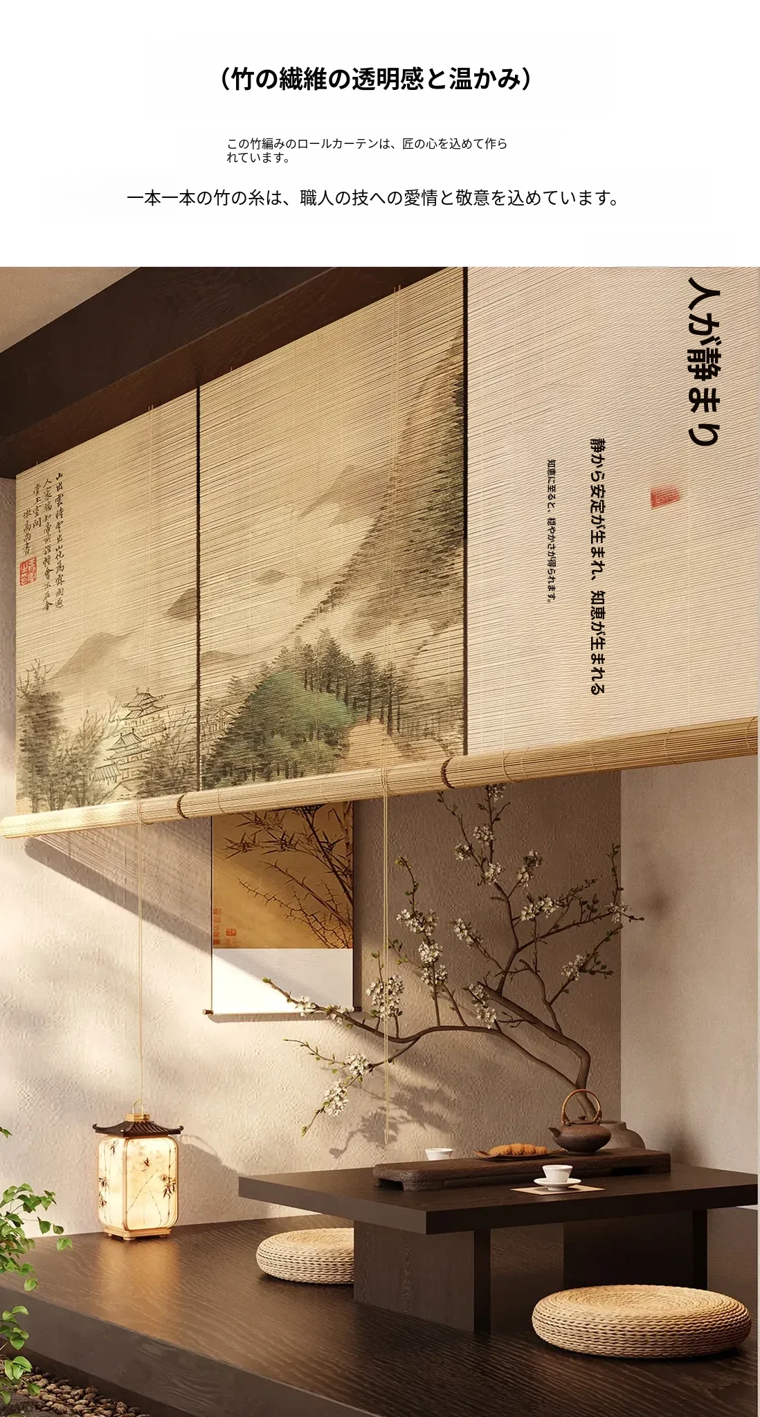 新中式古風竹製ロールカーテン - 宋代美学を感じる茶室にぴったり!遮光・遮熱効果抜群、取り付け簡単で壁を傷つけないデザイン。優雅な雰囲気で空間を演出する竹編みのカーテン。