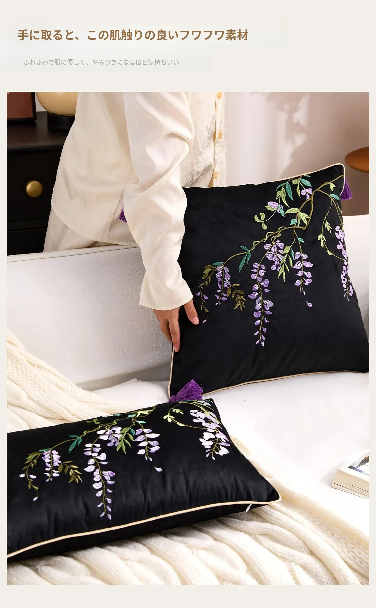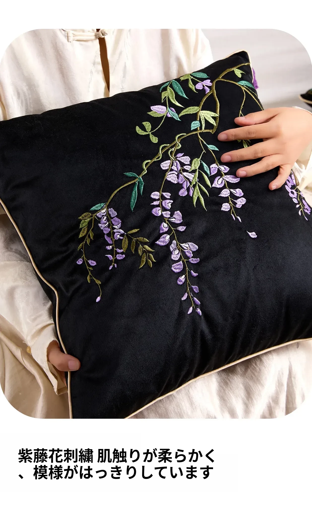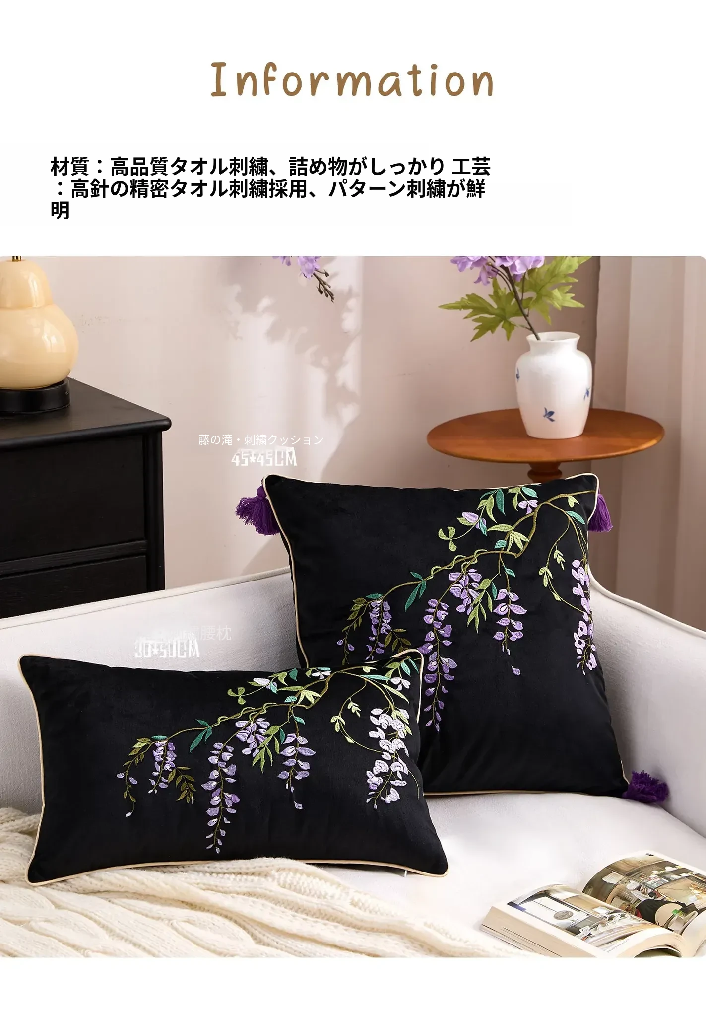 紫藤の滝刺繍クッション【45*45cmカバー+クッション芯】