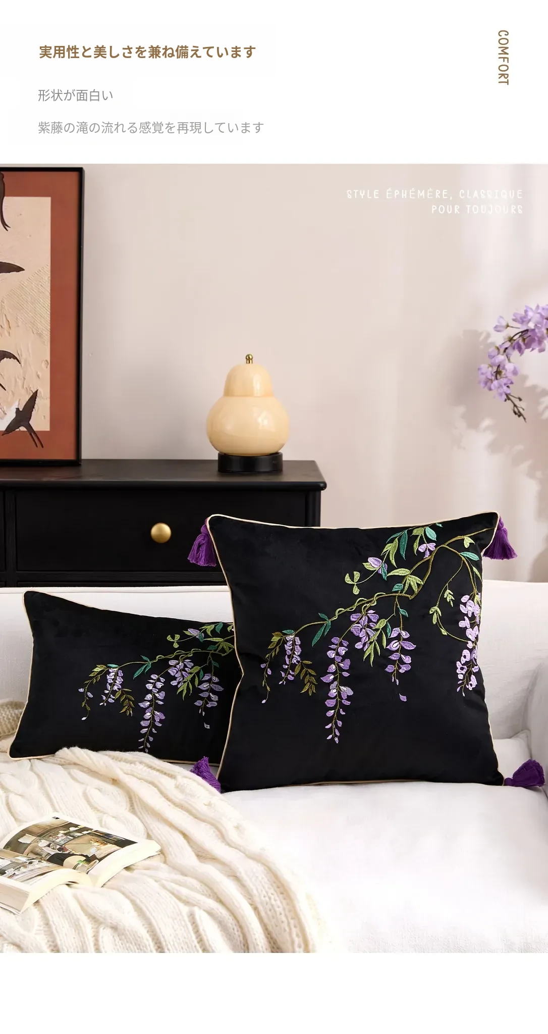 紫藤の滝刺繍クッション【45*45cmカバー】