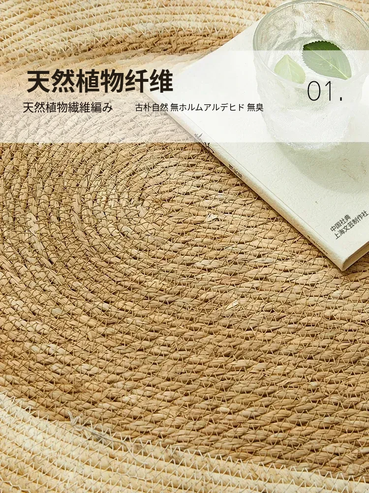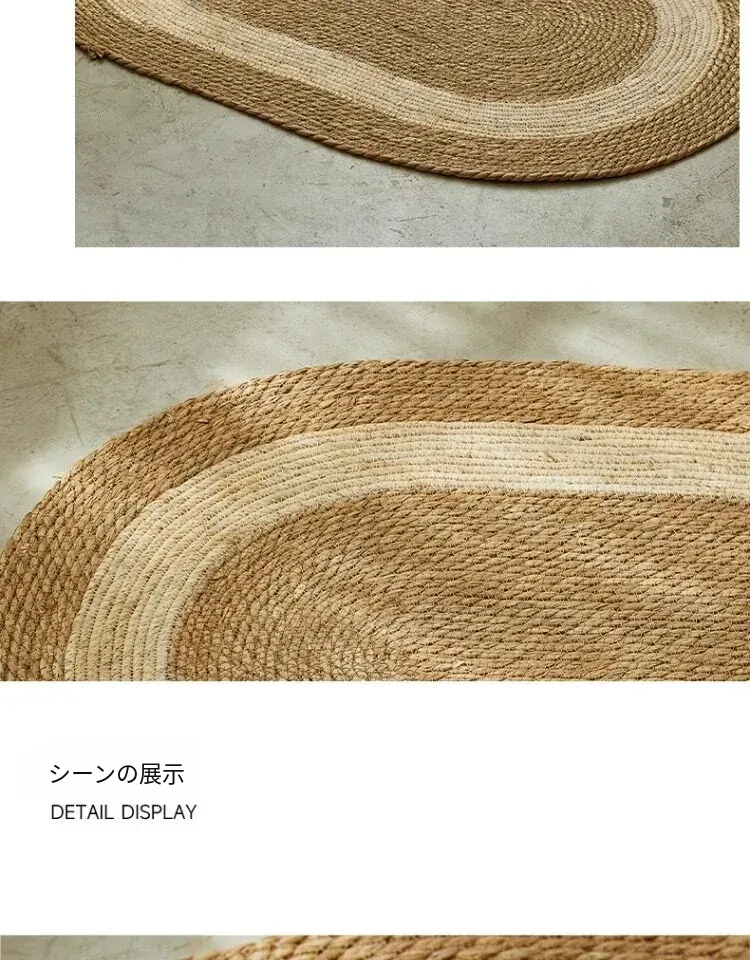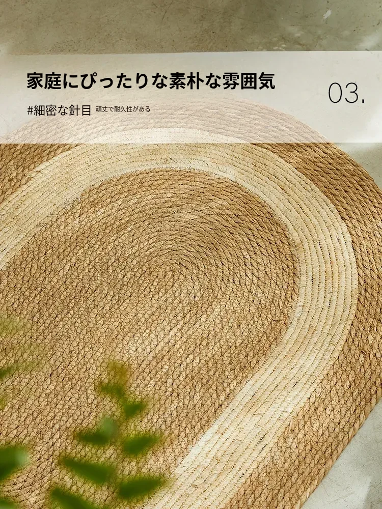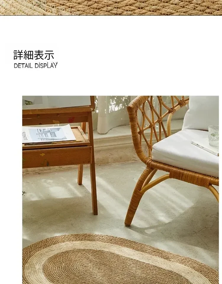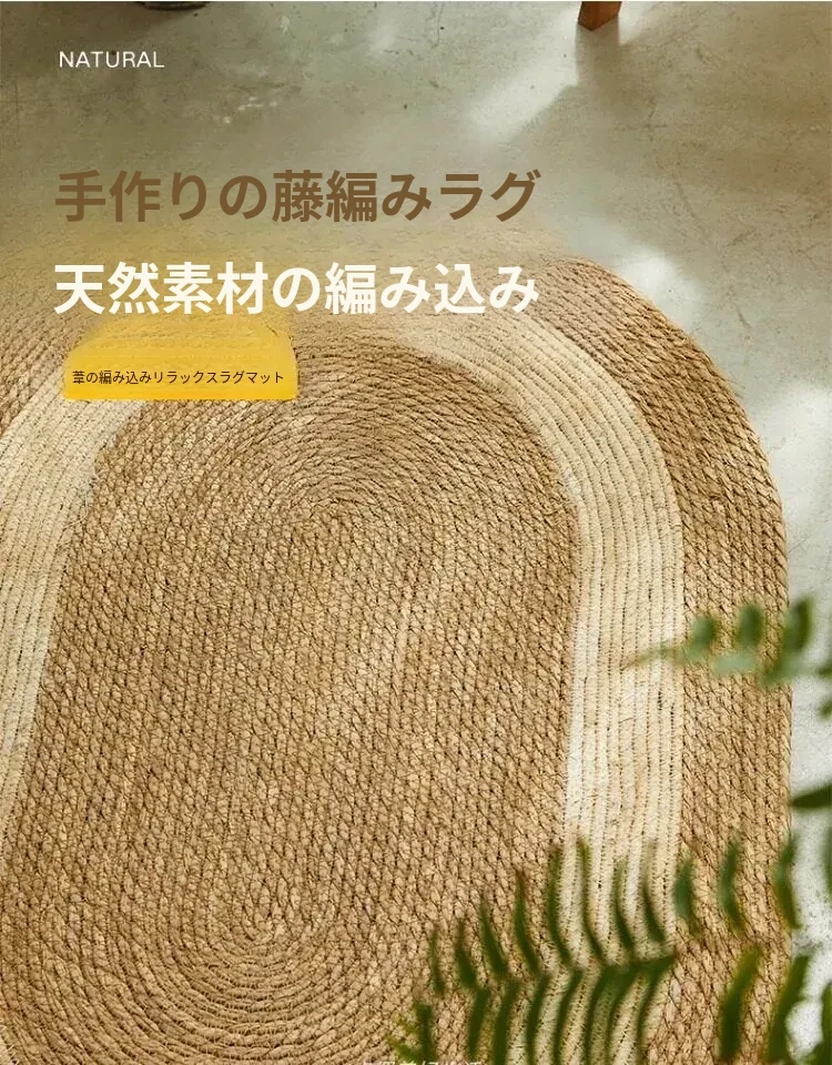 天然素材の藤編みラグマット - おしゃれな楕円形デザインで、寝室や民宿のインテリアに最適!茶卓や畳、窓辺にぴったりなカーペットで、心地よい空間を演出します。