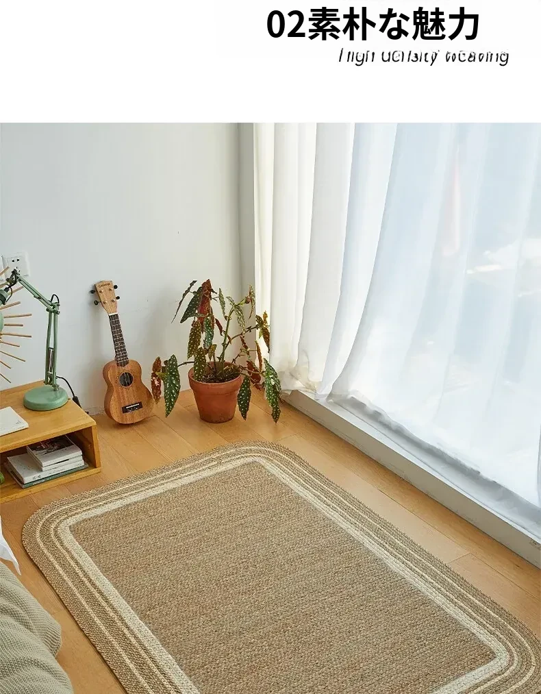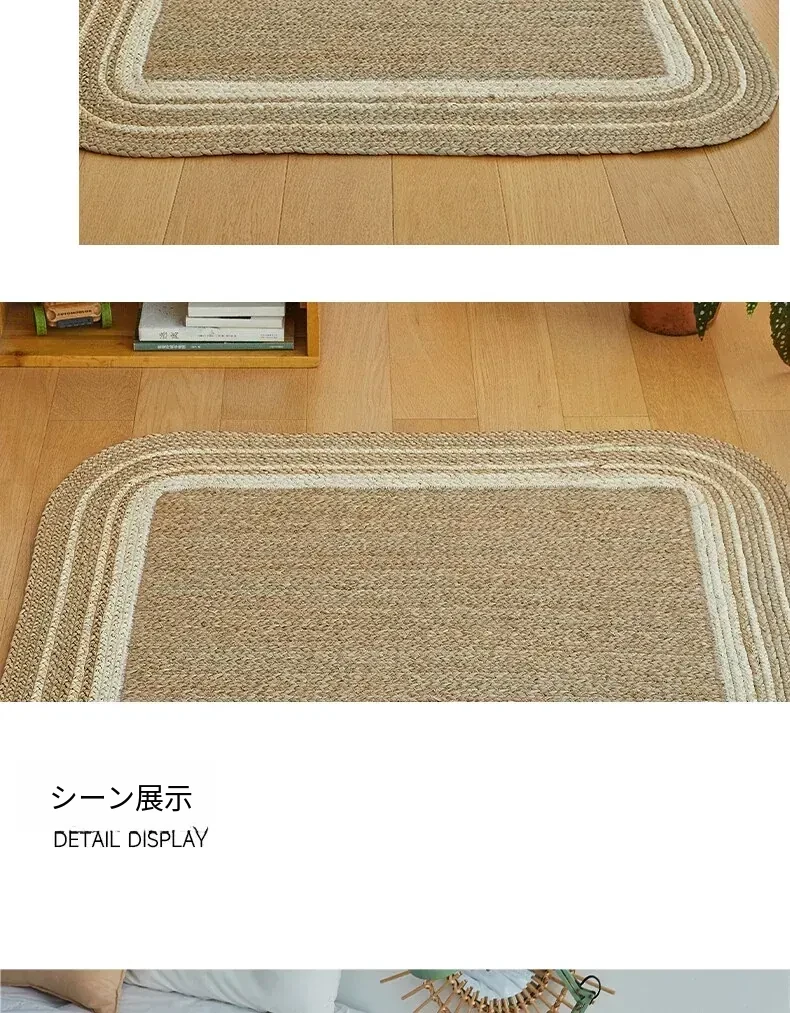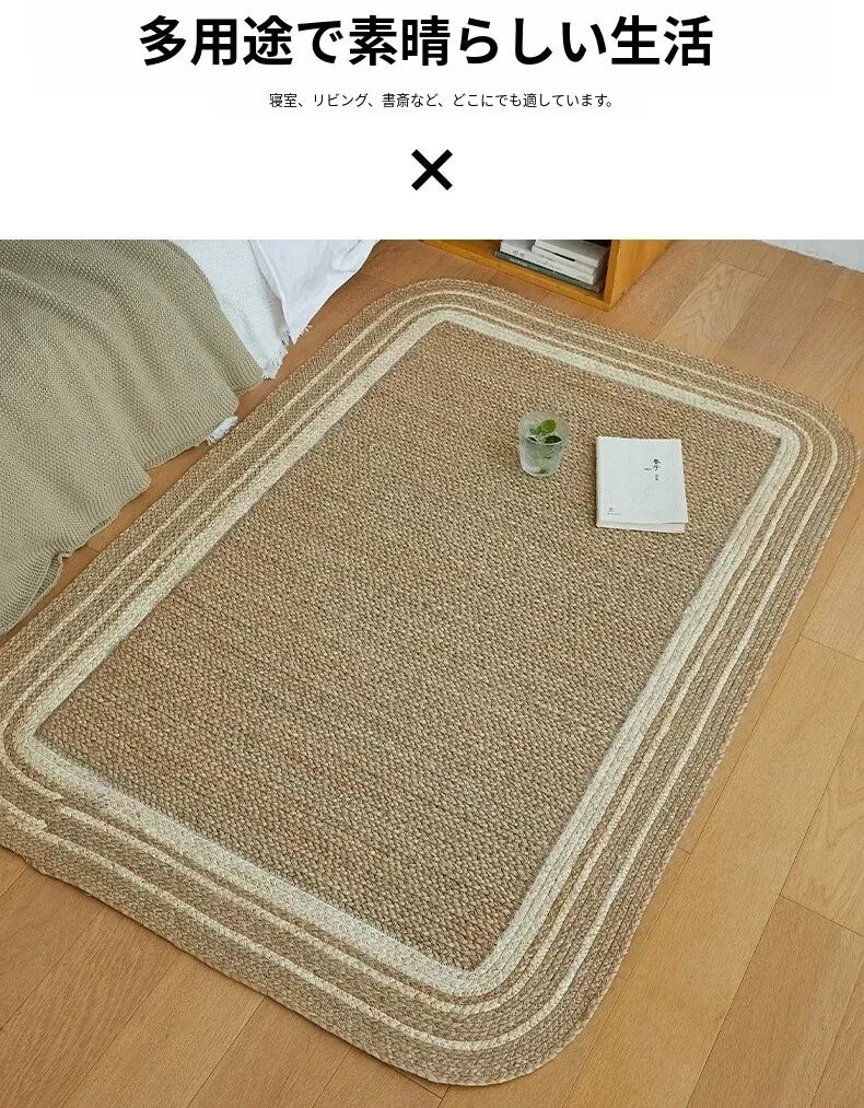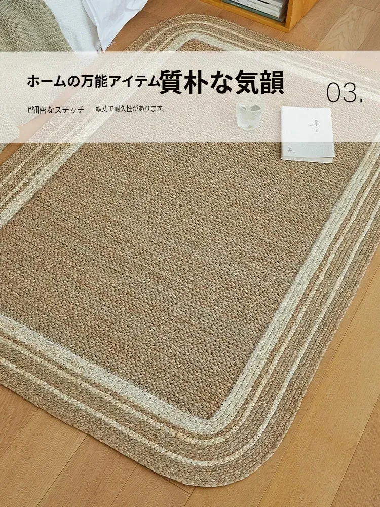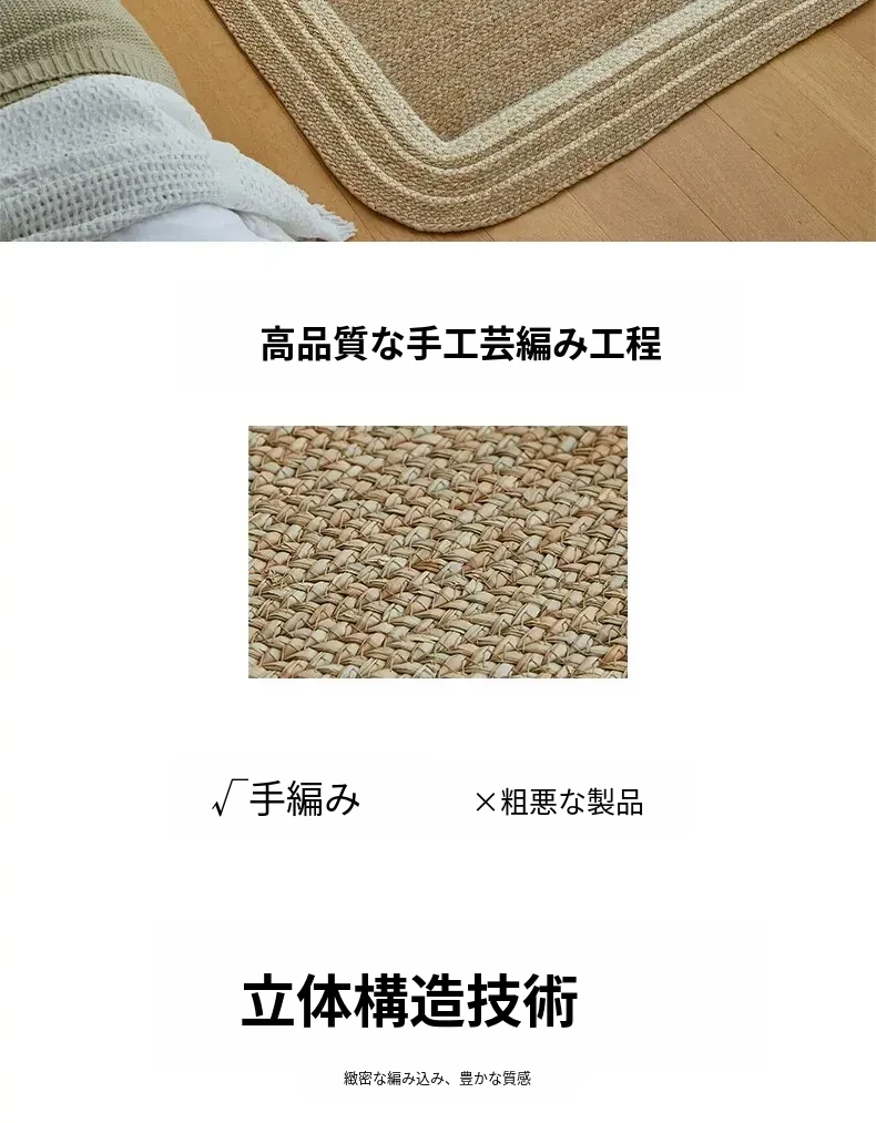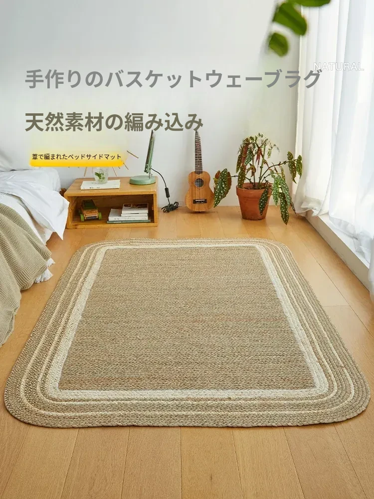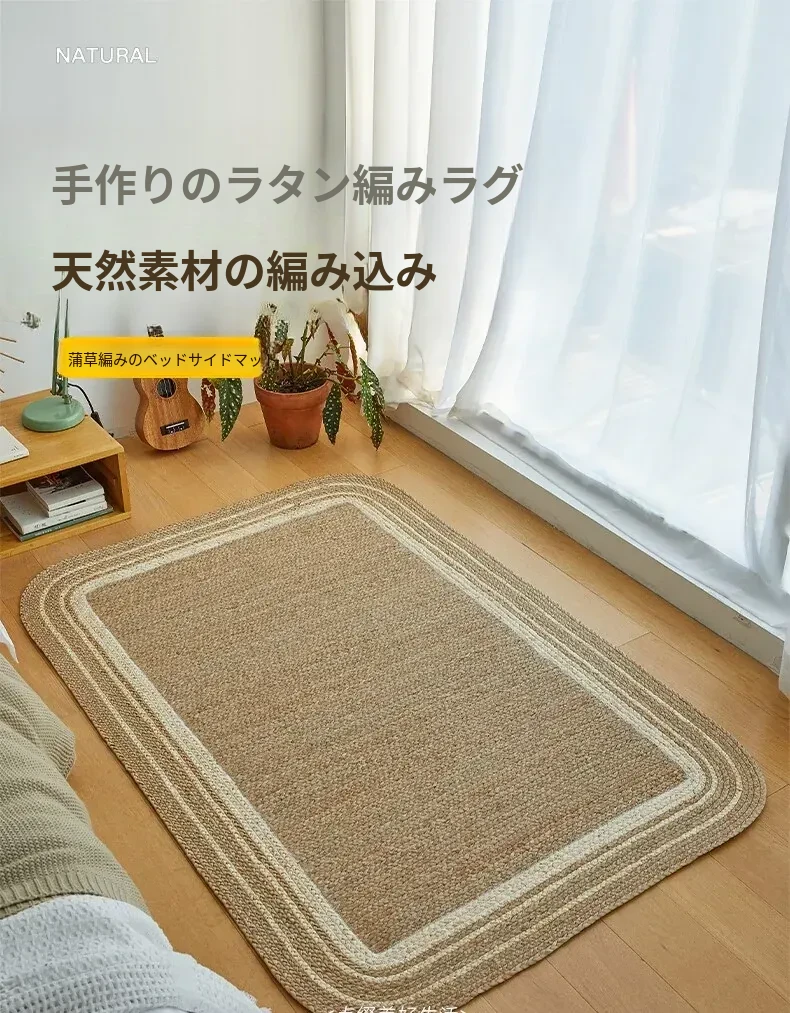 手作の草編みラグマット - 厚手デザインで客間やソファにぴったり!高級感あふれる民宿スタイルのベッドサイドマット。リラックス空間を演出するおしゃれアイテム!