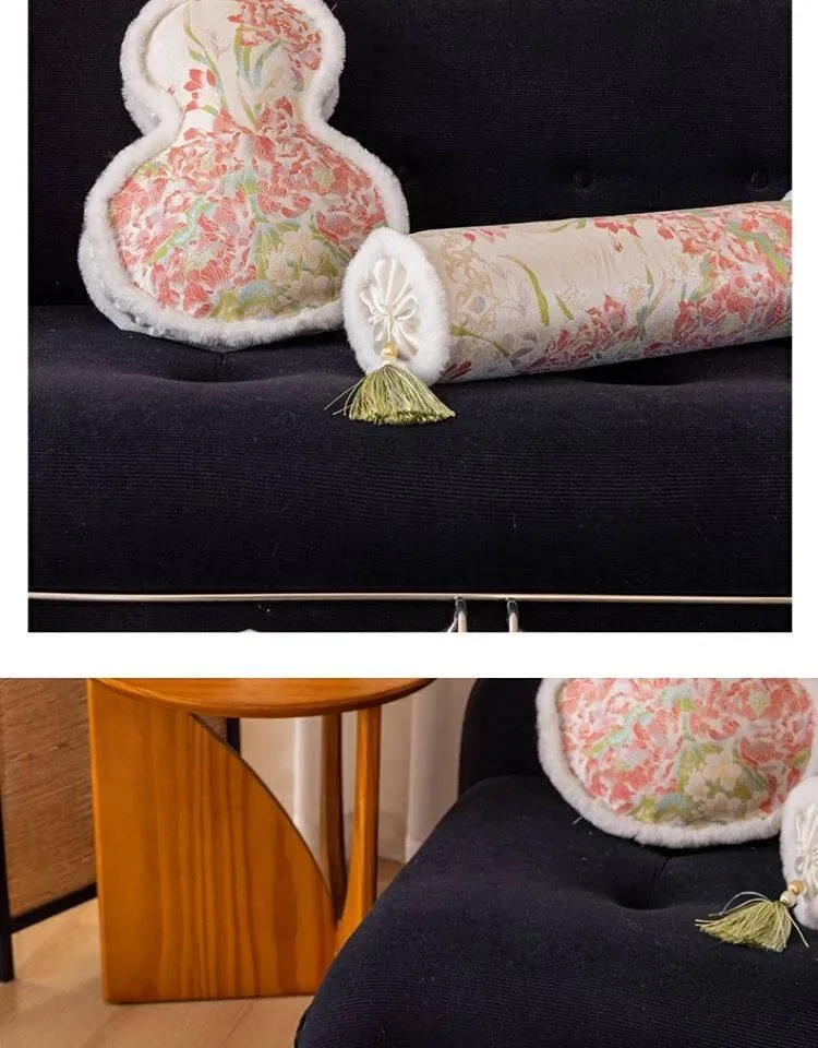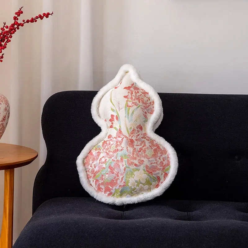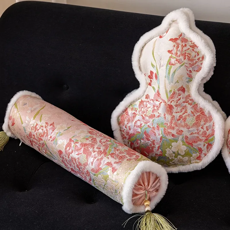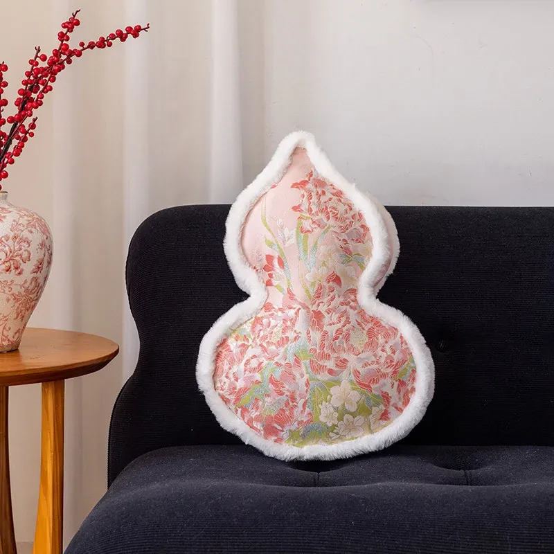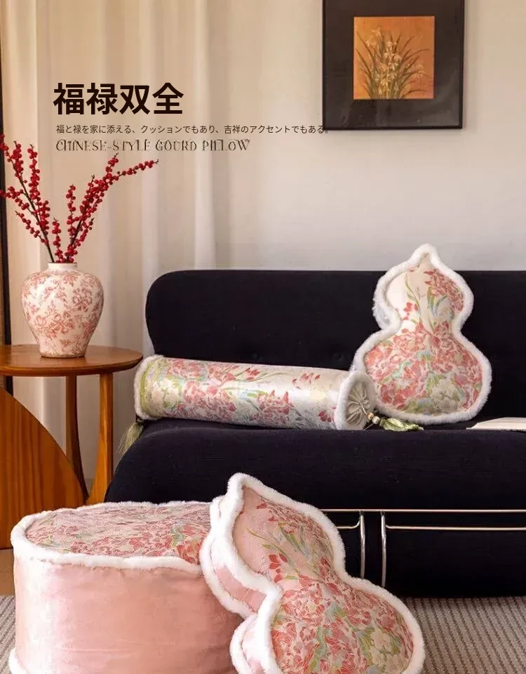 新中式ピンクのひょうたん型クッション|ベッドサポート&ヘッドボード|プリンセス風リビングソファ用|豪華な芍薬デザインのユニークなクッションで、お部屋を華やかに演出!