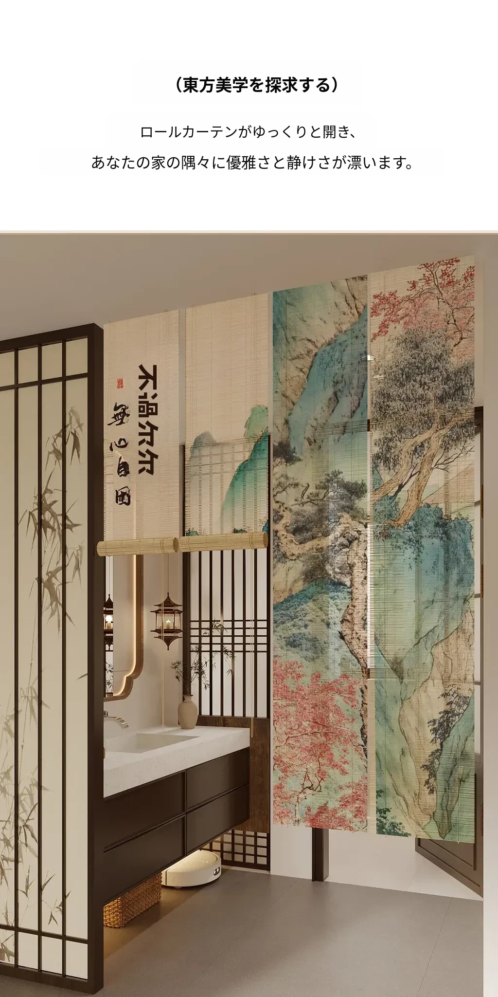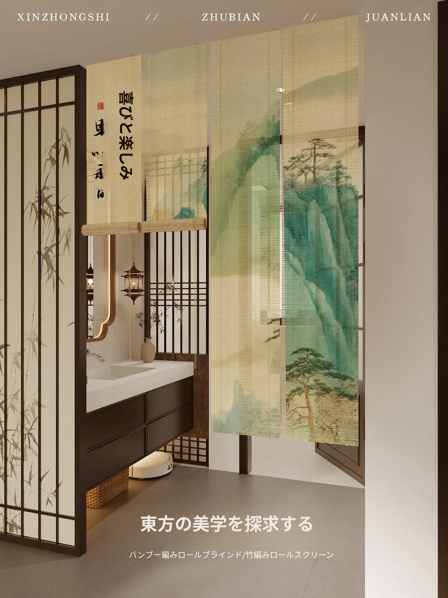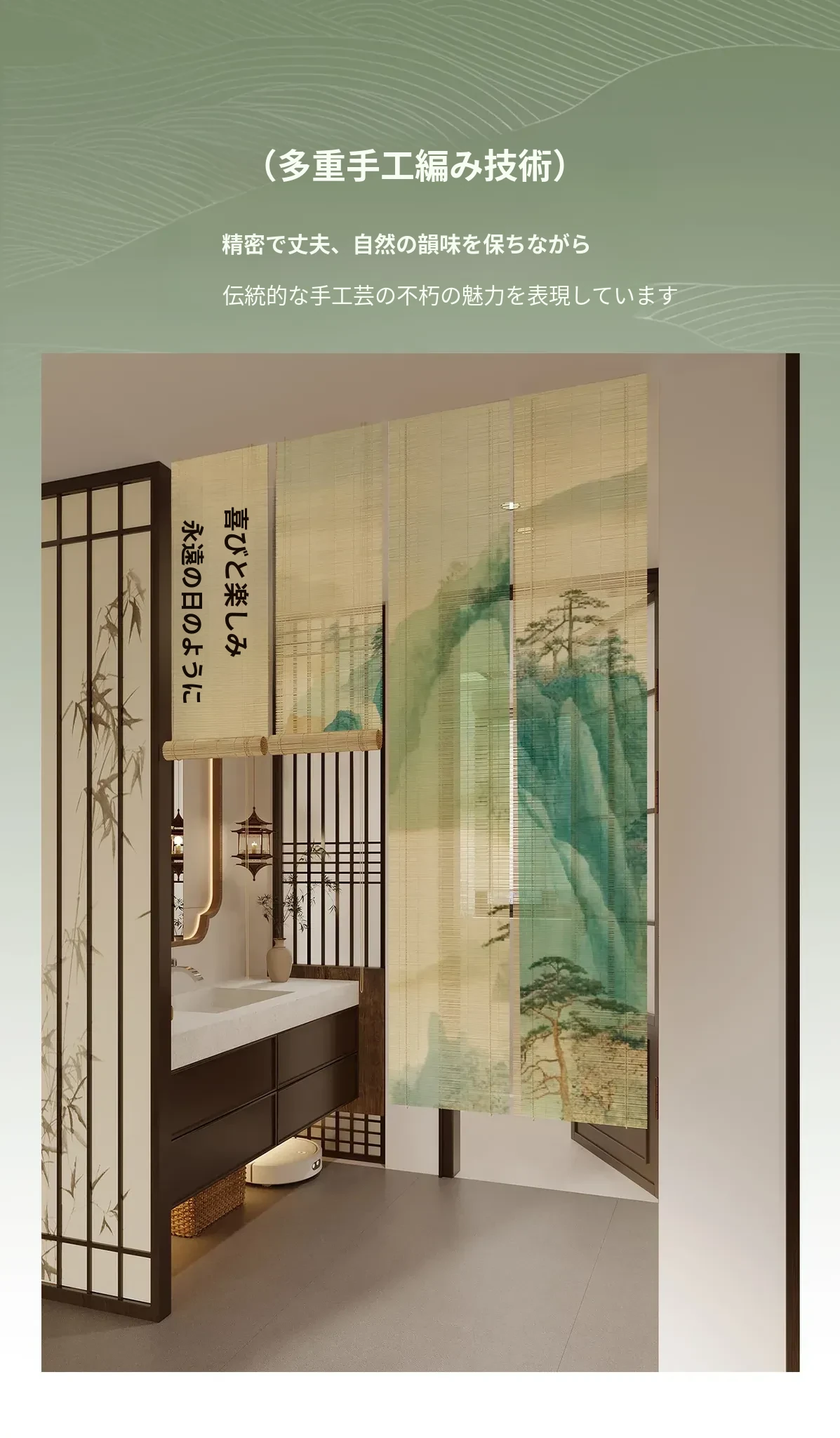 宋氏美学の中華風禅スタイル竹製ロールカーテン - 茶室にぴったりの竹編み掛けカーテン!簡単取り付け、穴あけ不要、上下調整可能な日差しカットで、和の空間を優雅に演出します。