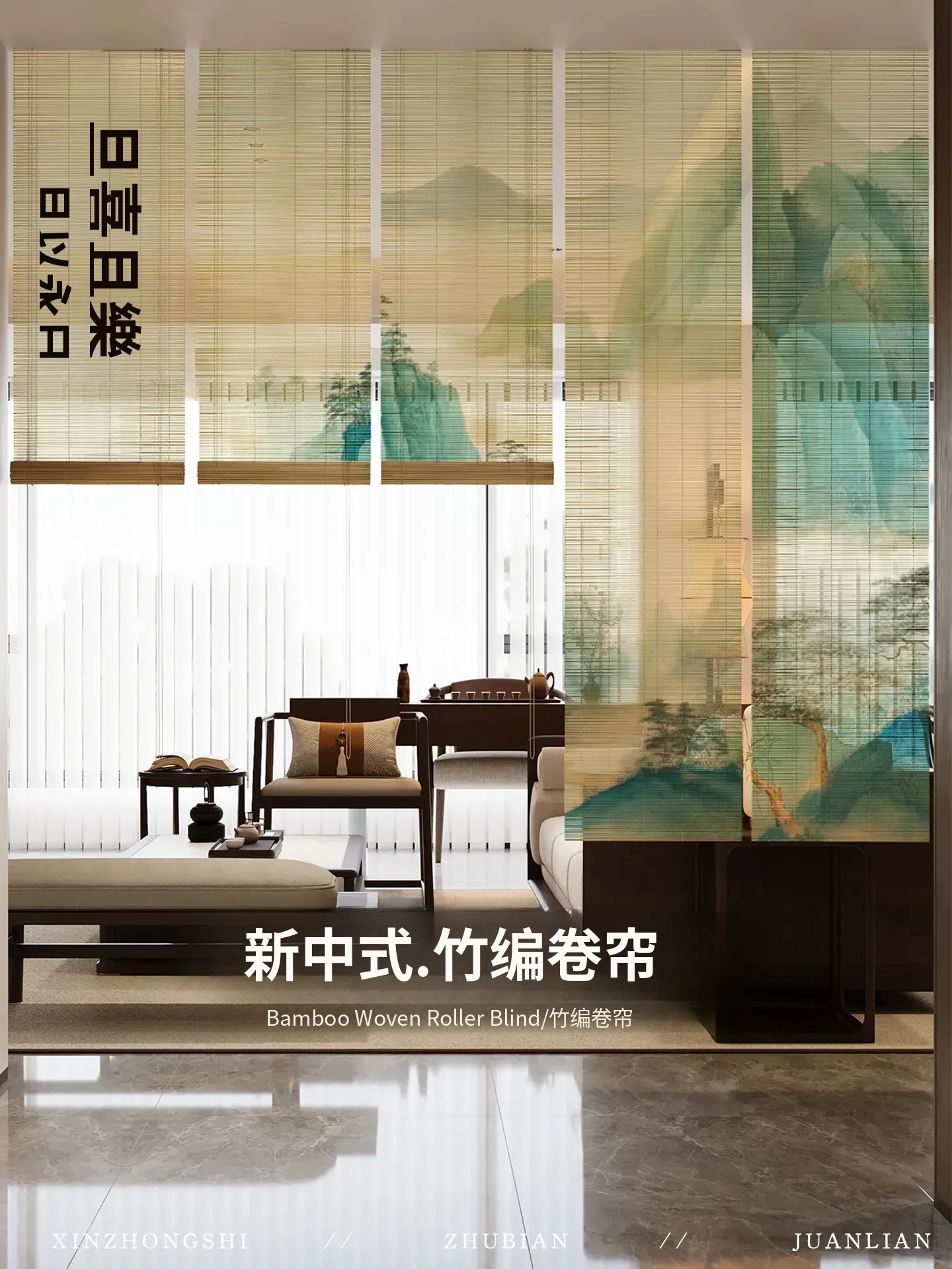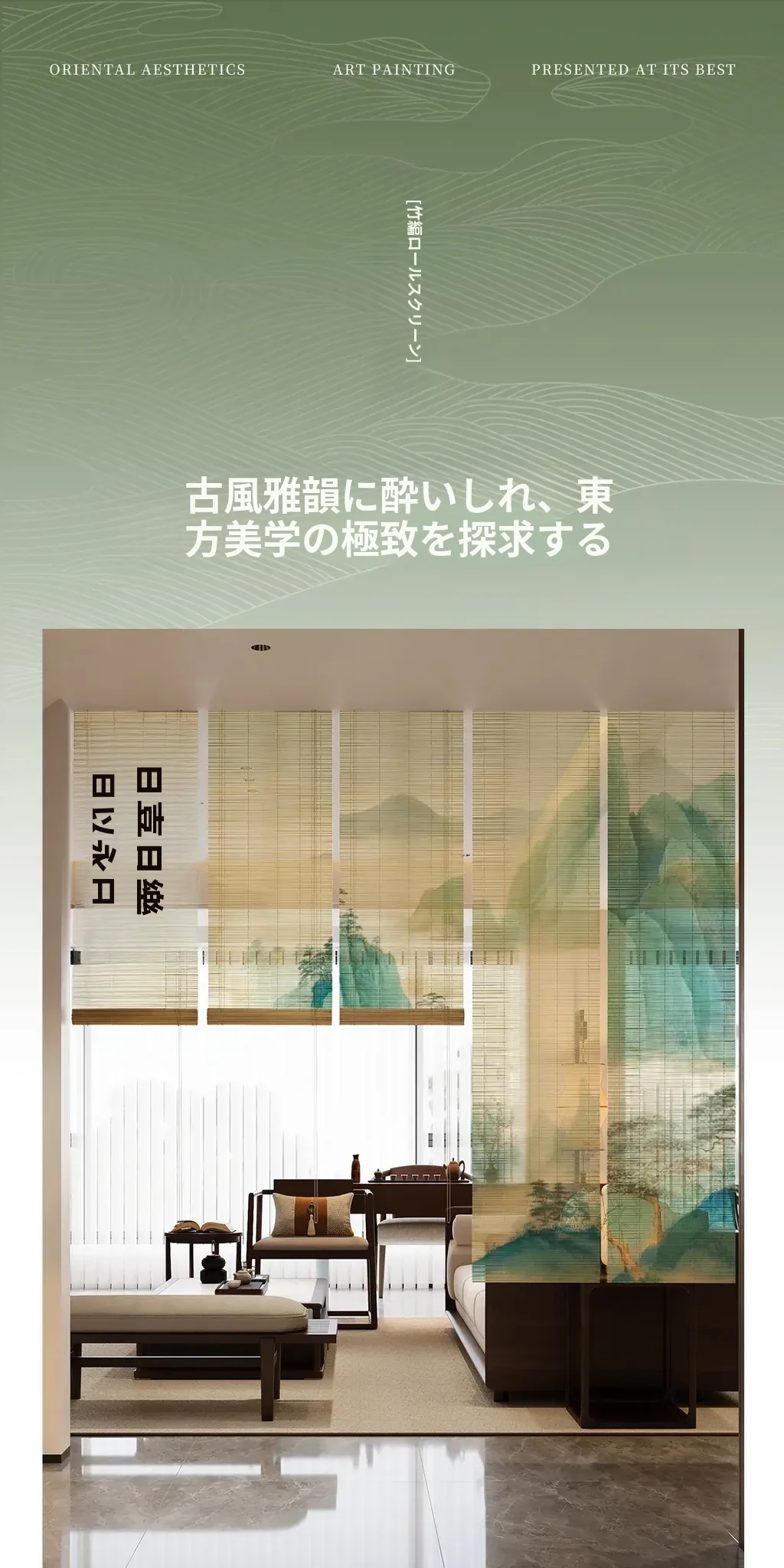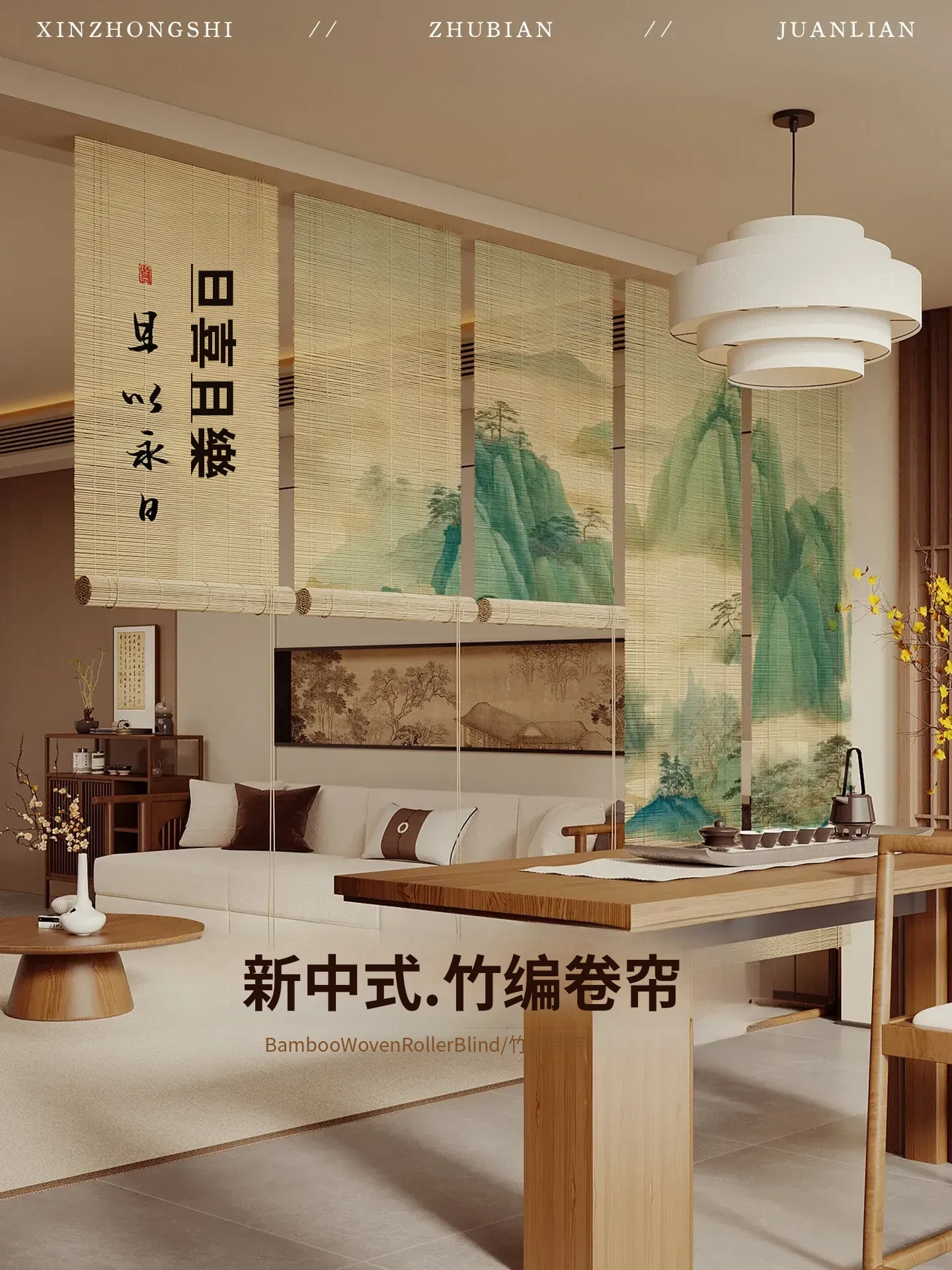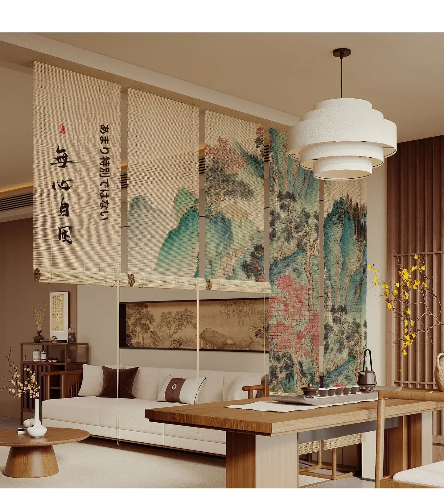 宋氏美学の中華風禅スタイル竹製ロールカーテン - 茶室にぴったりの竹編み掛けカーテン!簡単取り付け、穴あけ不要、上下調整可能な日差しカットで、和の空間を優雅に演出します。